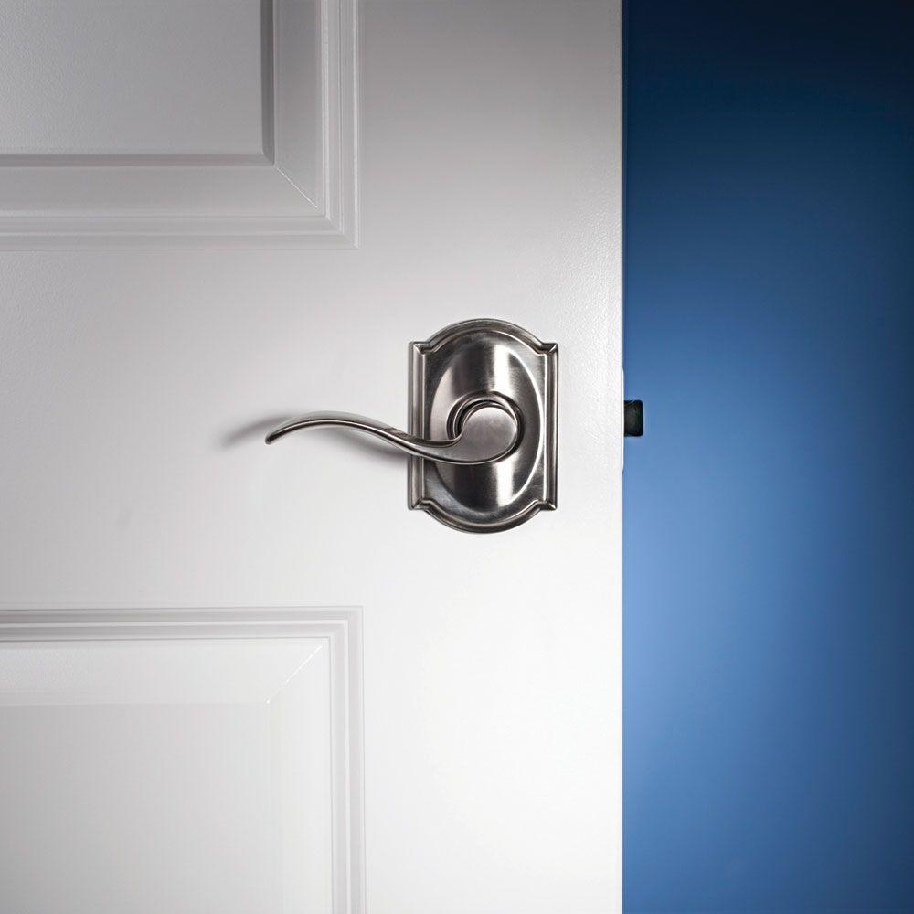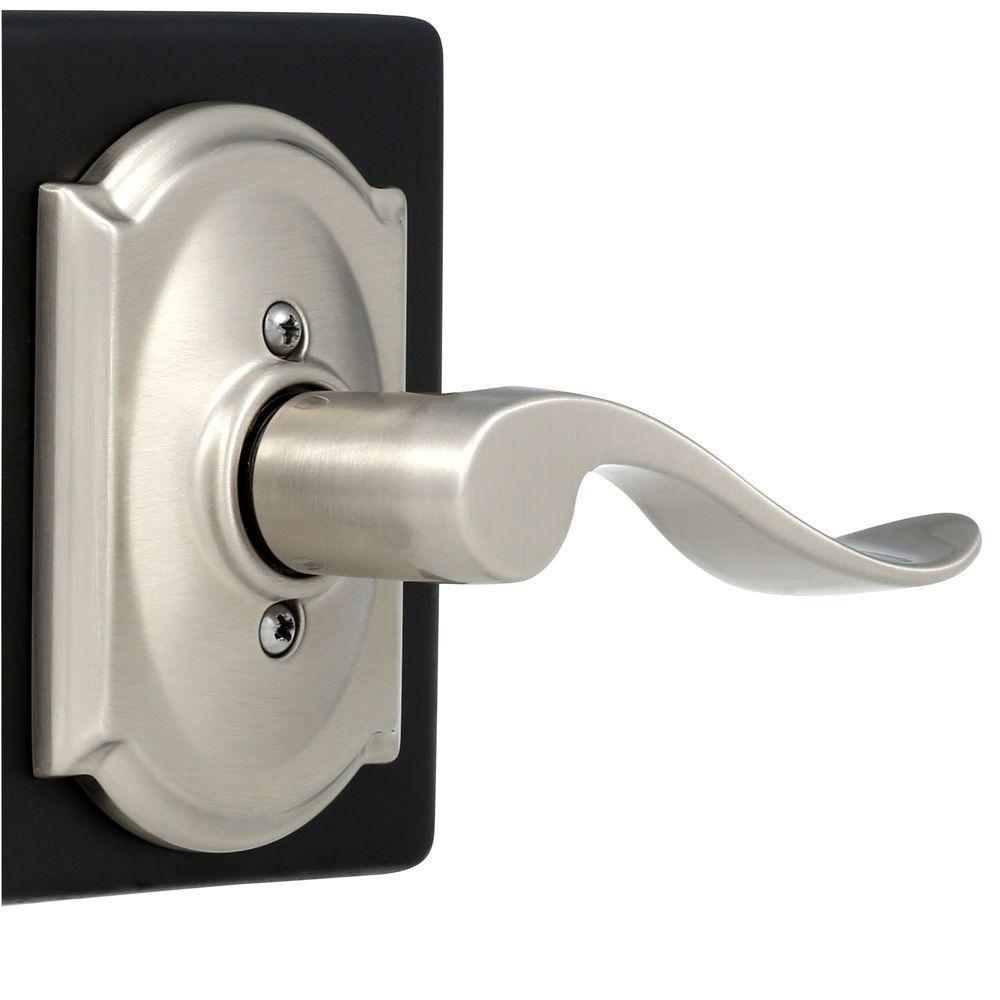 The Schlage Accent Satin Nickel Passage Door Lever with Camelot Trim is perfect for use on hall and closet doors where locking is not needed. The interior Accent Lever is widely popular for its elegant wave-like design that effortlessly matches a room’s style without overshadowing it, while the Camelot trim's scalloped architectural details make any room charming and approachable. This lever us particularly stylish when wrapped in our versatile Satin Nickel finish. The universal design of this passage door lever set allows it to be mounted to left or right swing doors. Plus, it’s been designed and tested with strength and durability in mind.