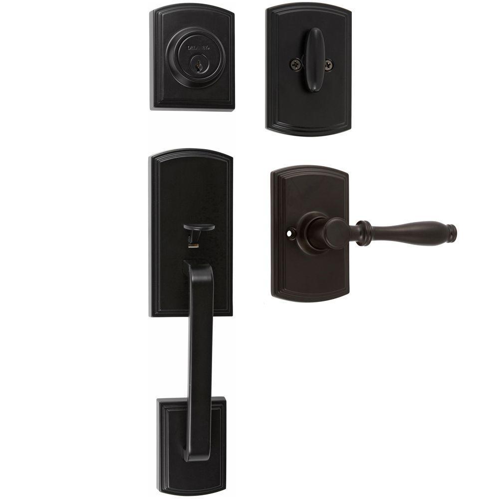 The Delaney Designer Series Italian Collection was inspired by the simple elegance of Venice and the timeless appearance found in Tuscany. The Visconti entrance handleset with exquisite straight lines and enlarged back plate adds style and value to any home. The black finish complements a wide selection of interior design options. The upper trim is a single cylinder deadbolt which is operated with a key on the outside and a thumb turn on the inside. The lower trim is a Sorado lever for either a left hand door (LH) or right hand (RH) door. Handing is determined by standing on the outside of the door noting on which side the hinges are located hinges on the right side is a RH door, hinges on the left side is a LH door.