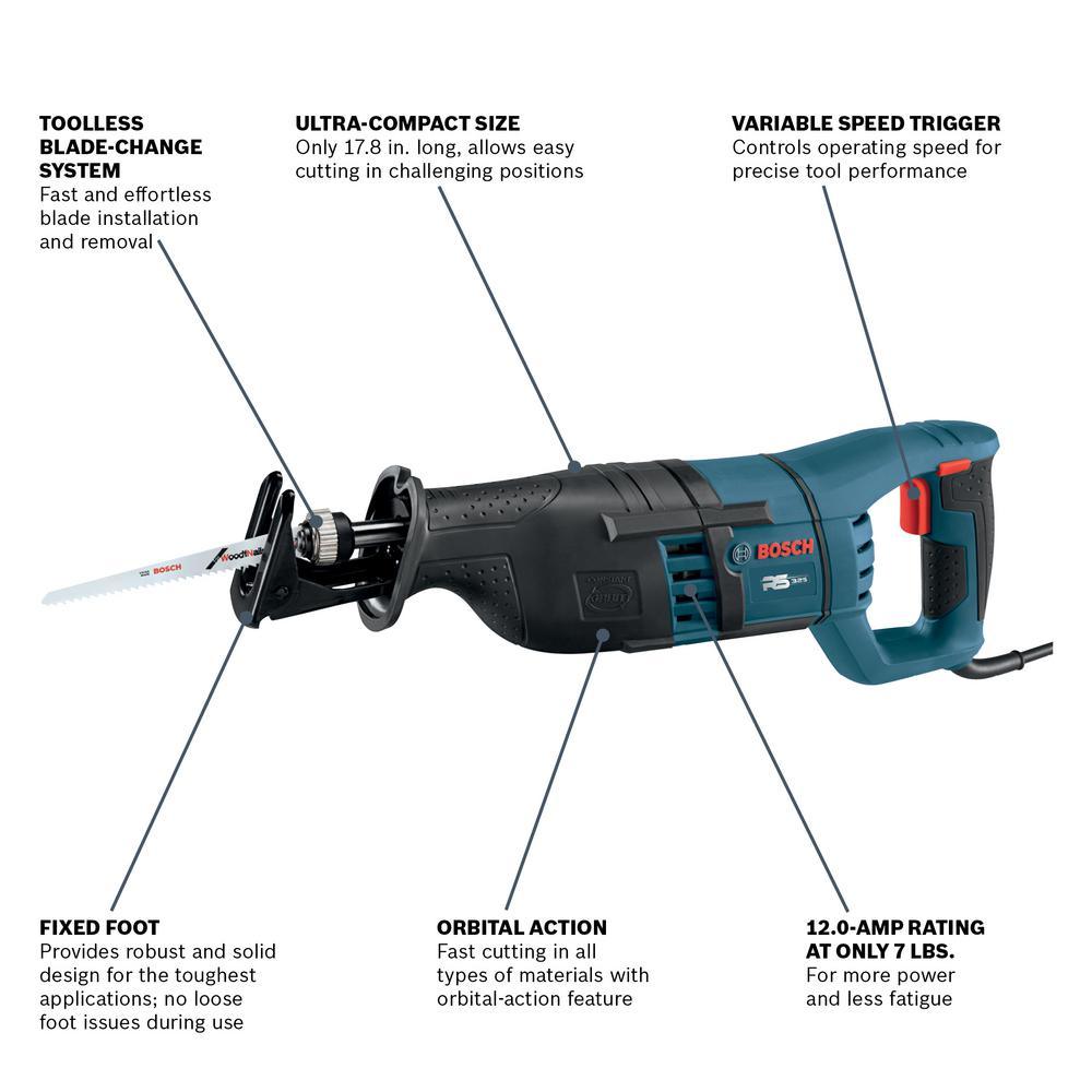 The Factory Reconditioned Bosch RS325 offers 12 Amp of power at only 7 lbs. provides the ability to cut through the toughest materials with ease, speed, and comfort. At only 17.8 in. long allows easy cutting in challenging positions, especially overhead for less fatigue with light weight design. The blade change system - Most robust blade holder system for reliable and durable expectations. Rugged Bosch quality for all job site environments.