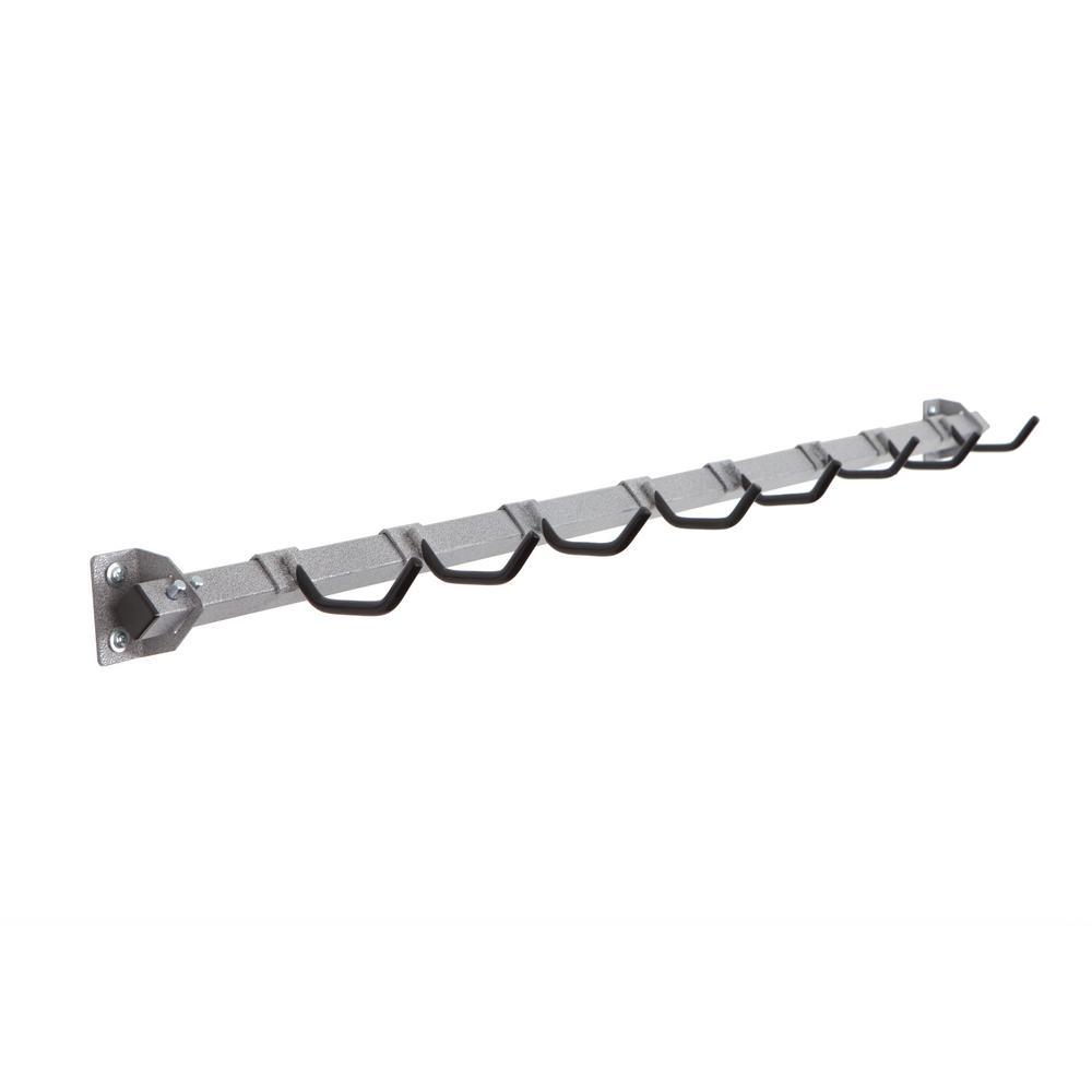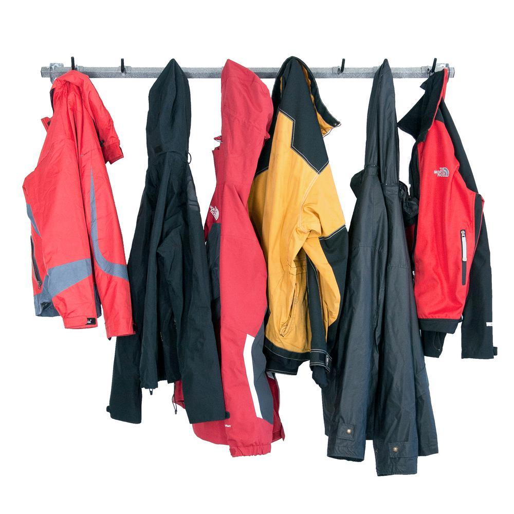 The Large Garage Coat Rack by Monkey Bars allows you to hang 8 adult coats of any size. The long hooks allow for hanging even the heaviest coats. This coat rack takes only 4 screws and 15 minutes to install. The Coat Rack requires only 4 ft. of wall space and extends a mere 3 from the wall with coats hanging. This wall mounted coat rack is perfect for any garage, shop, warehouse, barn, closet, or tack room and is also suitable for outdoor use.