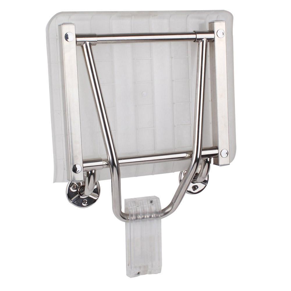 A compact, wall-mounted shower seat that folds up to save space and folds down for secure, comfortable seating. Made from water-resistant plastic with chrome-finished hardware and stainless steel support for durability in wet environments.