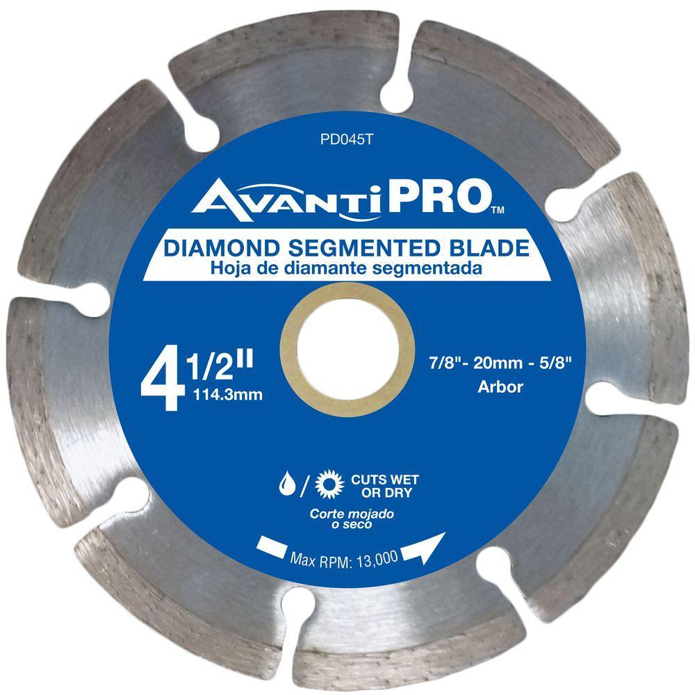 The AvantiPRO 4.5 in. Segmented Diamond Blade provides the best cutting performance and long life for all of your DIY projects. Use the segmented rim blade for fast and aggressive cuts on concrete, brick, block, stone, and stucco. This blade will fit most small angle grinders.