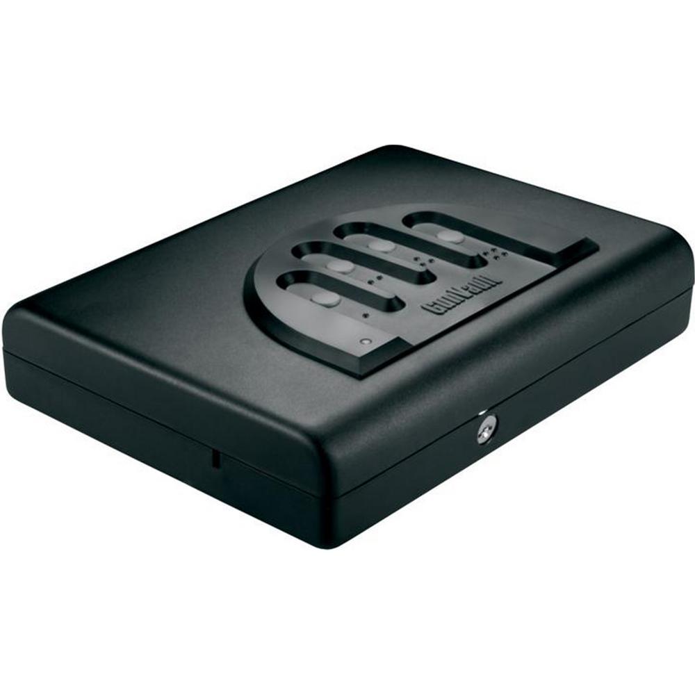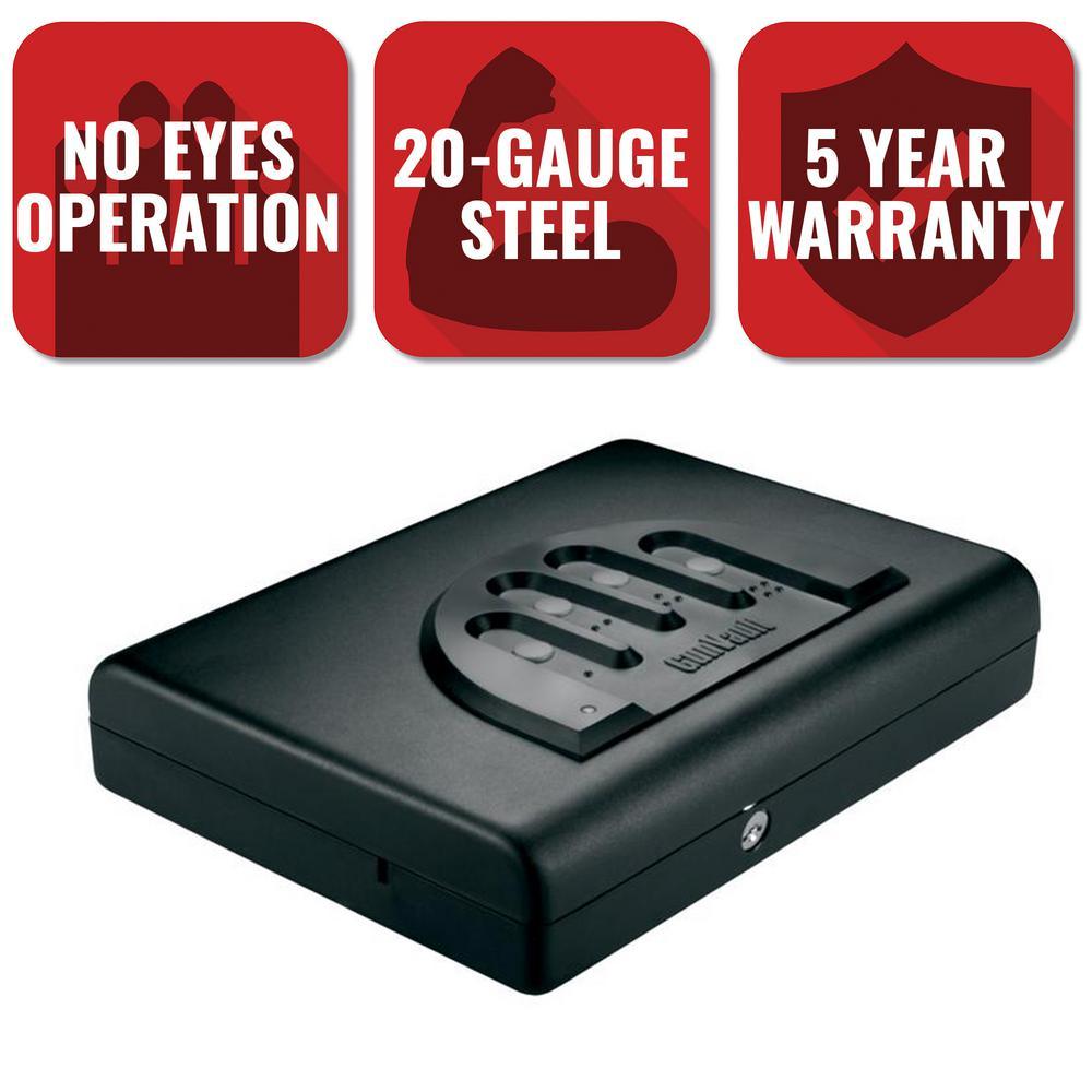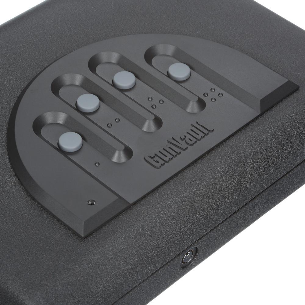 GunVault handgun safes are truly premium products that set the standard for the rest of the industry. We know that security and reliability are prevailing priorities when you need our products, and that's why GunVault handgun safes have the features you want. The MV500-STD comes with our patented No-Eyes keypad that provides lightning-quick access, even in the dark. The improved high strength lock mechanism and precise fittings make it virtually impossible to pry open with hand tools. Over 12 million user selectable access codes are available. The audio feedback feature instantly confirms correct keypad entries and can also be disabled to allow stealth mode operation. The safe is battery powered for maximum security and easy portability. A tamper indicator notes invalid entry attempts and a built in computer blocks access after repeated invalid keypad entries. The MV500-STD comes standard with a 4 ft. security cable that allows you to tether it to a fixed object making it perfect for home and travel.