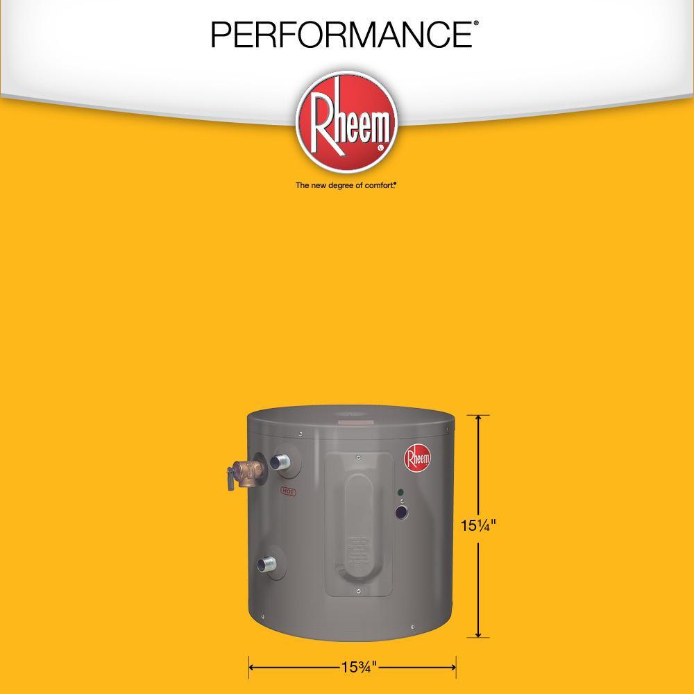 The Rheem Performance 6 Gal. Electric Point-of-Use Water Heater has a space saving design that's ideal for installations in tight spaces and can supply a quick source of hot water for a single application. The heater includes a 2,000-Watt element and a factory installed temperature and pressure relief valve. This point of use heater requires a 120-Volt electrical source for installation and can be mounted on a wall. This model has a 6-year limited tank and parts warranty plus a 1-year in home labor warranty.