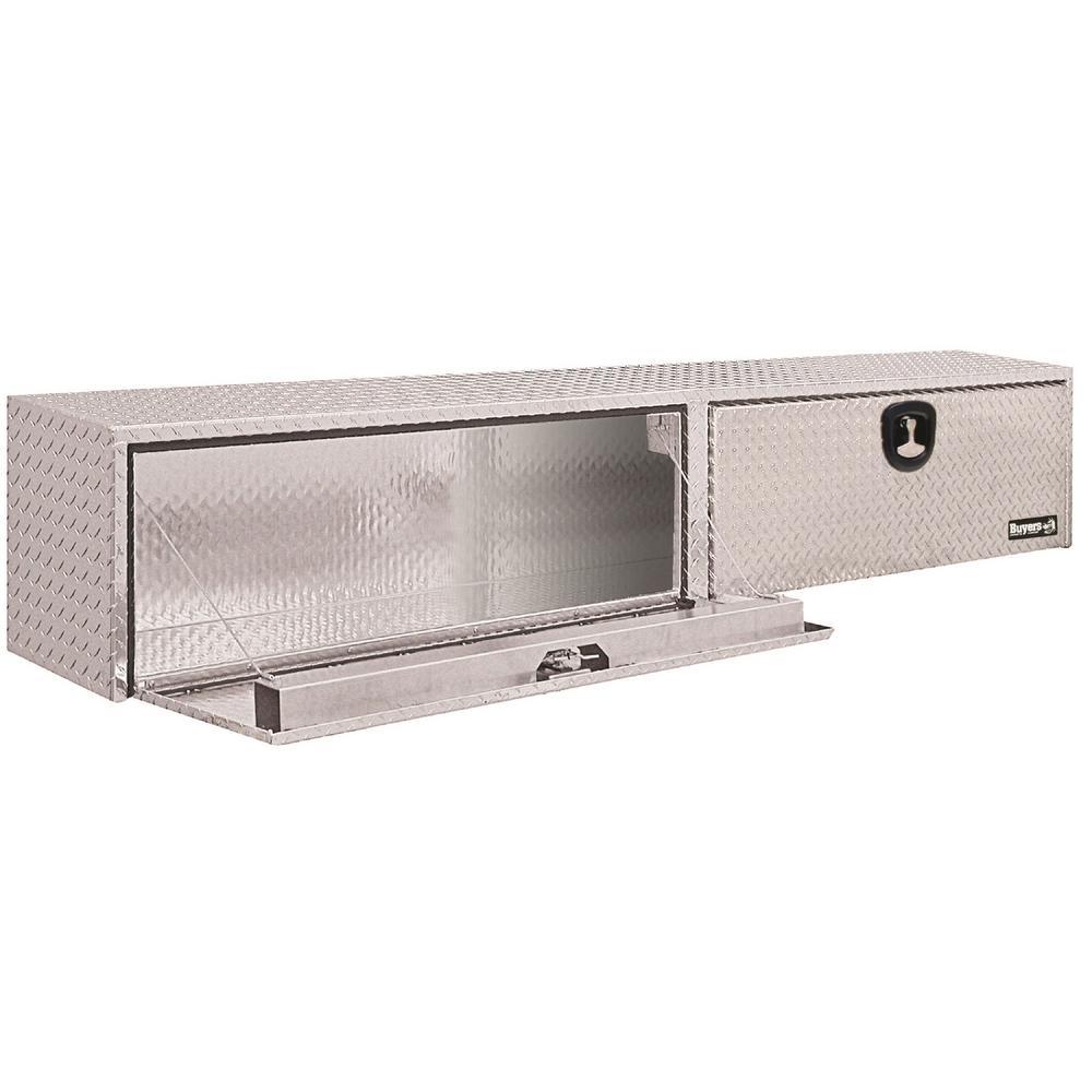 Buyers Products Diamond Tread Aluminum Topsider Truck Box mounts on top of the truck bed rails to save valuable storage space inside your truck bed. Each truck box is crafted with 0.100 in. thick aluminum and dual, recessed drop doors. Your equipment is better protected from the weather and theft with a shielded locking, die cast, compression latch system. Box is built for long life with aircraft grade cable lanyards, watertight continuous hinges, and 1/2 in. thick gasket sealing system.