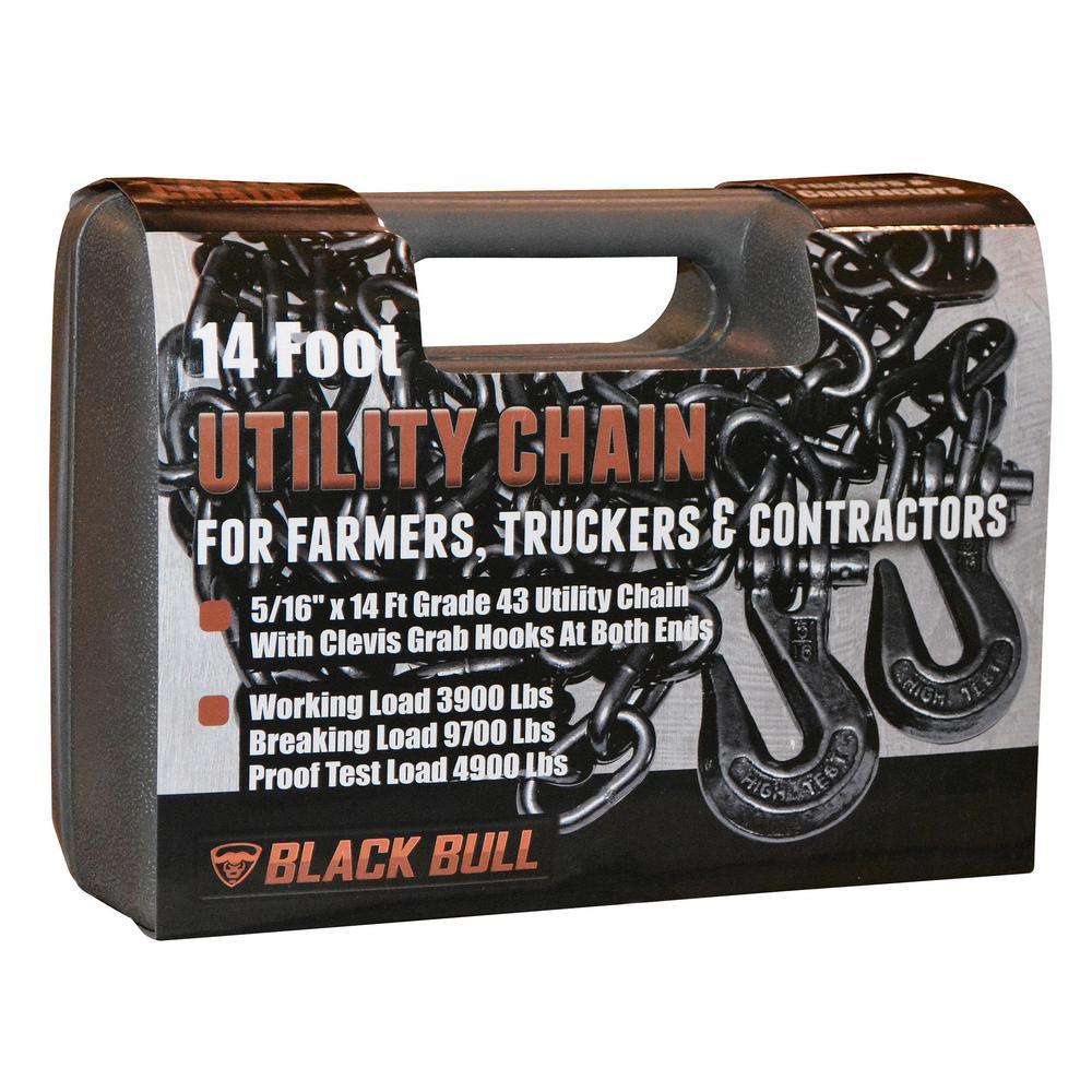 This 14-ft. utility chain allows you accomplish a variety of pulling, binding, securing and towing tasks with ease. Free a stuck vehicle, tow a disabled one or move fallen trees. The Grade 43 chain can be used with chain blocks or winch pullers, and it’s ideal for all types of loads. Built with two tons of towing strength, it features a forged steel clevis grab hook at both ends to assist with quicker hook-ups and releases. This durable utility chain measures 5/16 in. thick and includes a storage case.