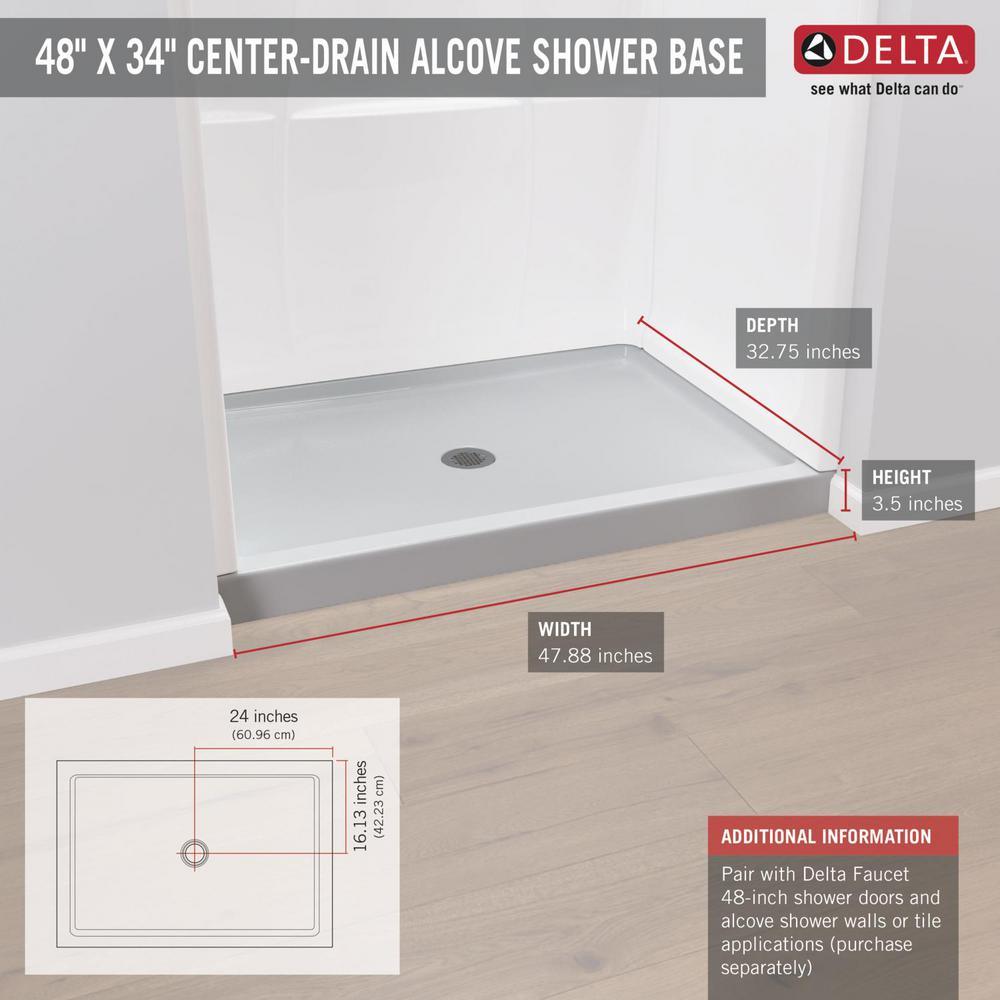 The Classic 400 34 in. x 48 in. Single-Threshold Shower Base features a premium high-gloss and nonporous acrylic surface that is durable and easy to clean. This shower base exudes strength without sacrificing style or design. It has built-in, reinforced support and a center drain design.