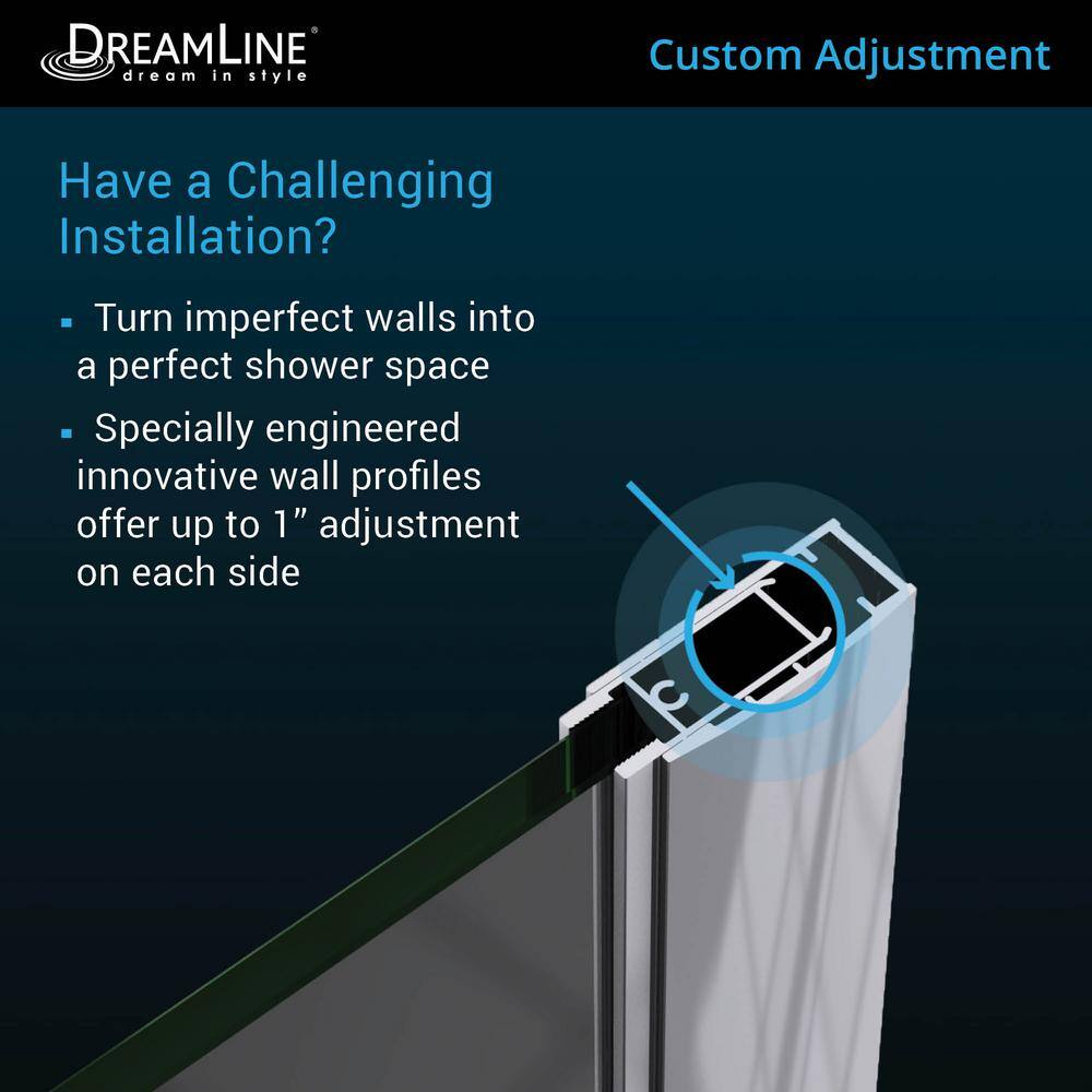Upgrade your alcove shower with the DreamLine Elegance, a semi-frameless pivot door featuring premium 3/8 in. tempered glass with ClearMax protective coating. Adjustable wall profiles accommodate out-of-plumb walls, and integrated glass shelves add storage and stability for a clean, modern look.