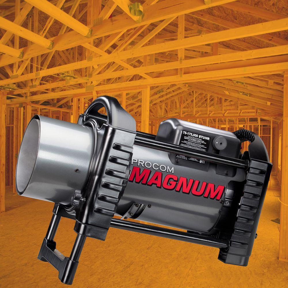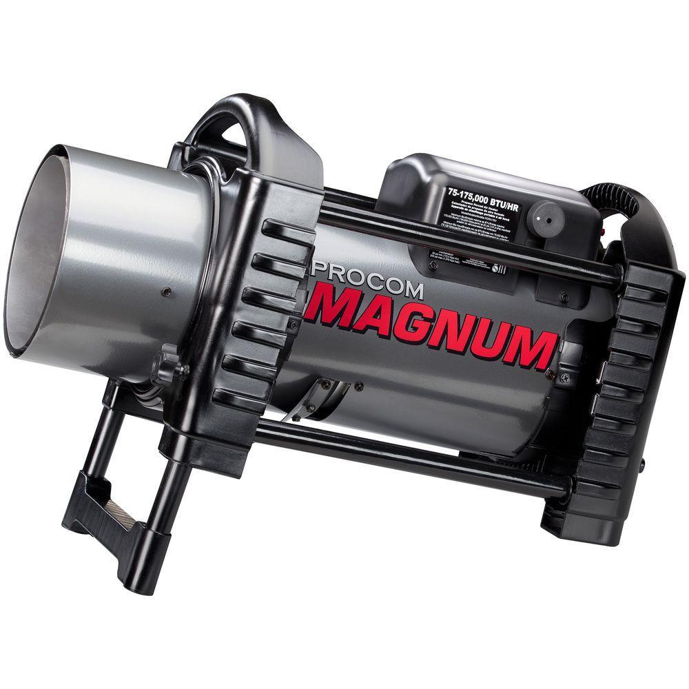 This high-performing ProCom Heating's 175000 BTU Portable Liquid Propane Forced Air Heater efficiently circulates heat throughout large areas. Designed for commercial use, it features heavy-duty components for lasting durability. Easy to operate, simply plug it into a standard household outlet and connect it to a propane tank. Ideal for providing worker comfort, it is also suitable for tasks like framing, dry-walling, curing concrete, and automotive work. With a variable output of 75,000 to 175,000 BTU and a patented power burner for quiet operation, it can heat spaces up to 3,400 sq. ft. The heater also includes a patented roll cage protection system, built-in safety shut down protection, automatic ignition, and is CSA certified. It comes with a 10 ft. hose and regulator, and features a cool-touch design for added safety.