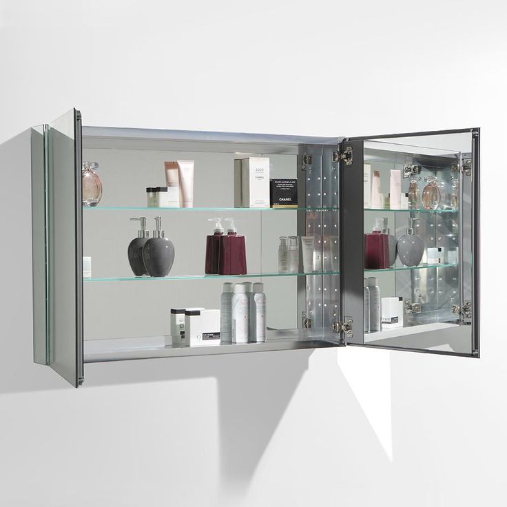 This 40 in. medicine cabinet features mirrors everywhere. The edges have mirrors and also on the interior of the medicine cabinet. The inside features two tempered glass shelves. Can be wall mounted or recessed into the wall.