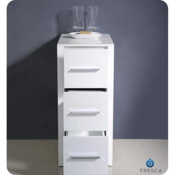 This side cabinet comes in an White finish. It has 3 spacious drawers and a sleek white glass stone composite top. The White finish matches all Fresca Torino White vanities. The white glass stone composite top matches the Torino white glass stone counter top shown with ceramic vessel bowl. Torino vanities with a white ceramic top and integrated ceramic bowl the white color with differ, these are two different materials.