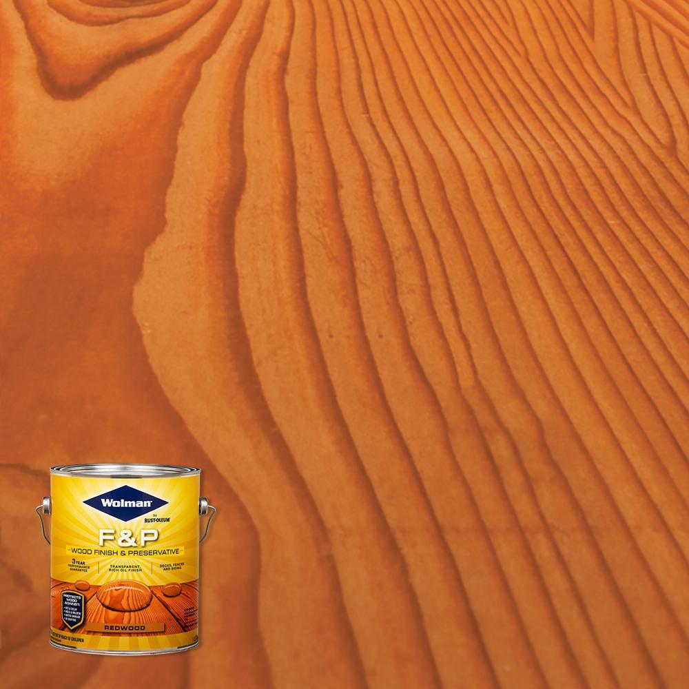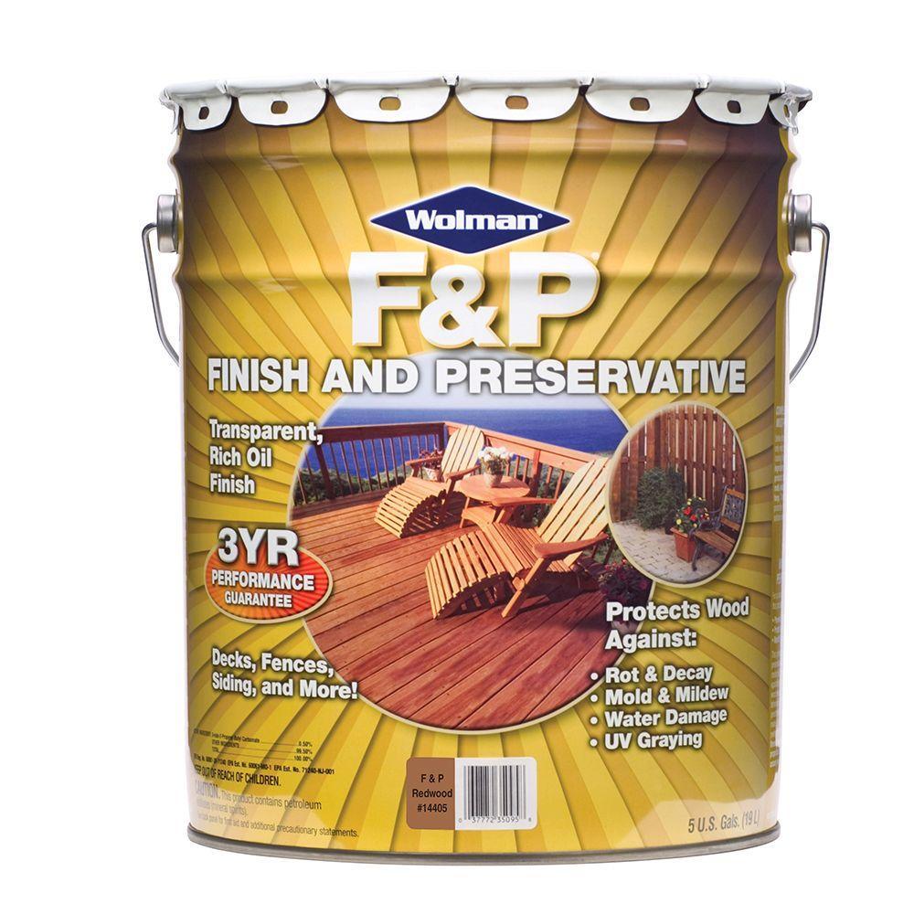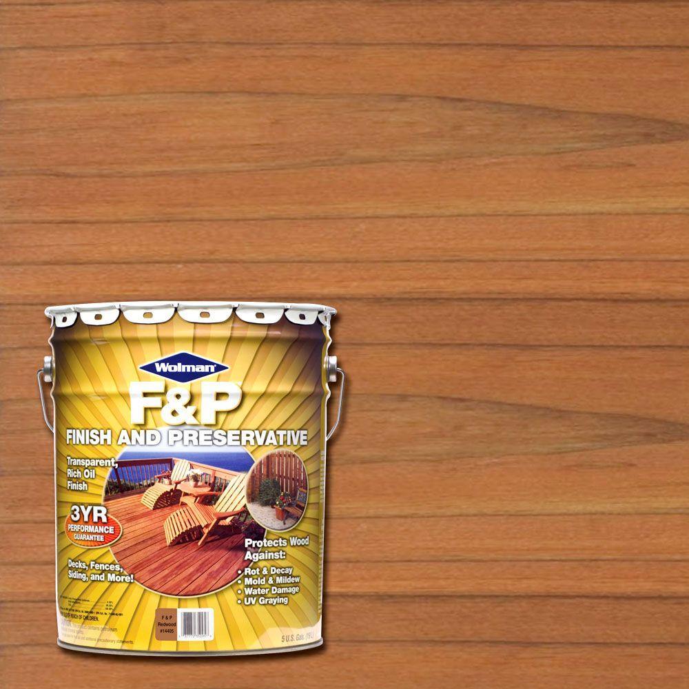 Regular price $98.82Wolman 5 gal. F&P Redwood Exterior Wood Stain Finish and Preservative is an oil-based wood finish that provides new or weathered wood with UV and water repellent protection. Protects against fading and graying. Provides transparent color in natural wood tones that reveal and highlight natural wood grain and texture.