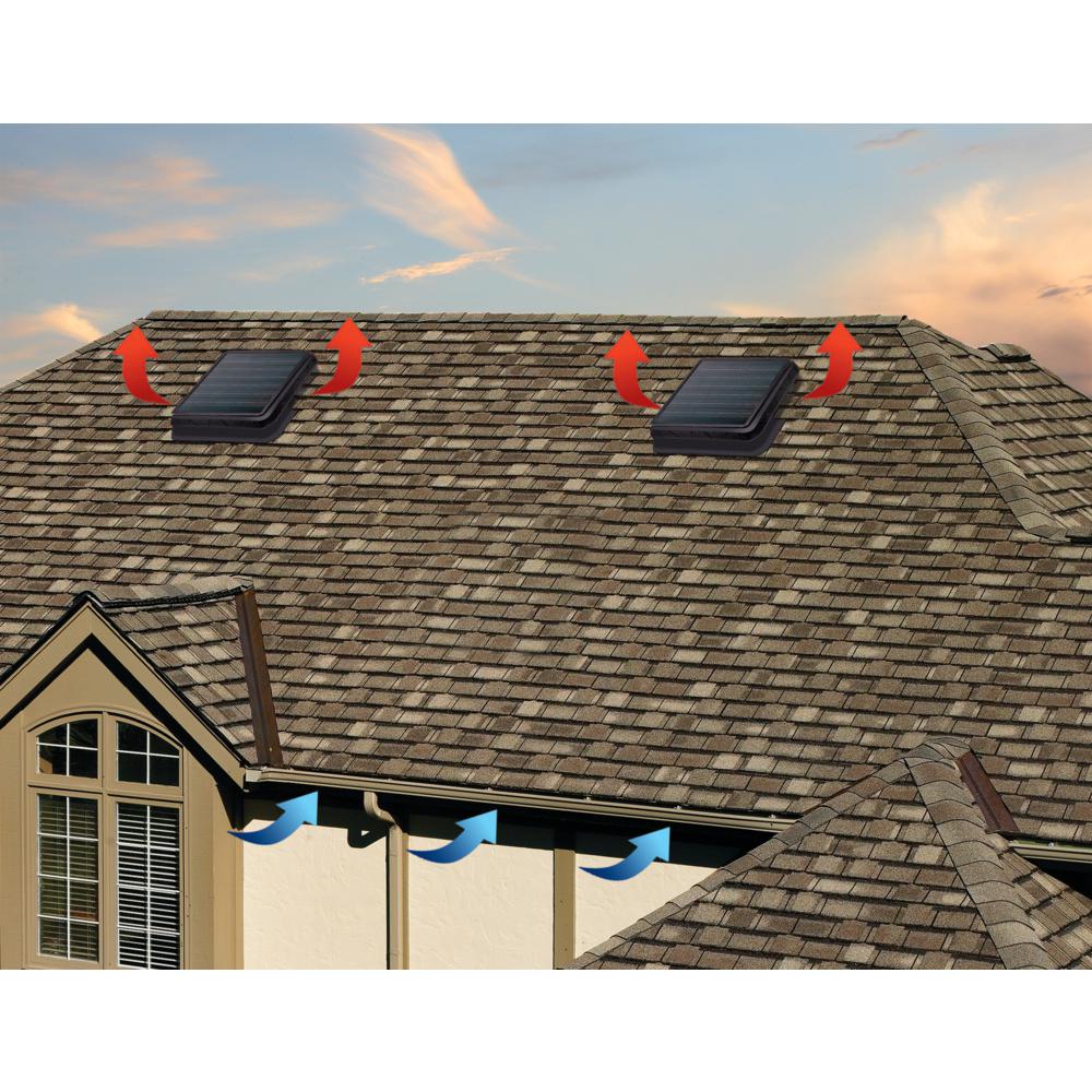 The GAF Master Flow 30-Watt Low Profile Solar Powered Roof Mount Exhaust Fan will help remove excess heat and moisture from your attic to protect your roofing system from premature deterioration and its low profile design enhances to appearance of your finished roof. The Solar Powered fan requires no wiring and uses no electricity. Hot attic air is removed from the attic by the fan as fresh air is drawn into the attic through your existing intake vents. The 24-Volt DC brushless motor provides airflow up to 750 CFM and requires no maintenance. The impact resistant, 30-Watt solar panel helps withstand hail and foreign object impact. Recommended usage for this unit is one unit per 1000 sq. ft. of attic space with a minimum intake ventilation of 560 sq. in. of net free area.