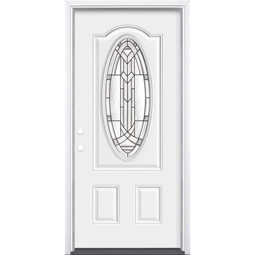 Bring strength and style to your entry with Masonite’s Chatham 3/4 oval decorative glass steel prehung door. The primed white steel slab with wood frame arrives fully assembled with brickmold, weatherstripping, and triple-pane insulated glass for energy-efficient performance and easy finishing.