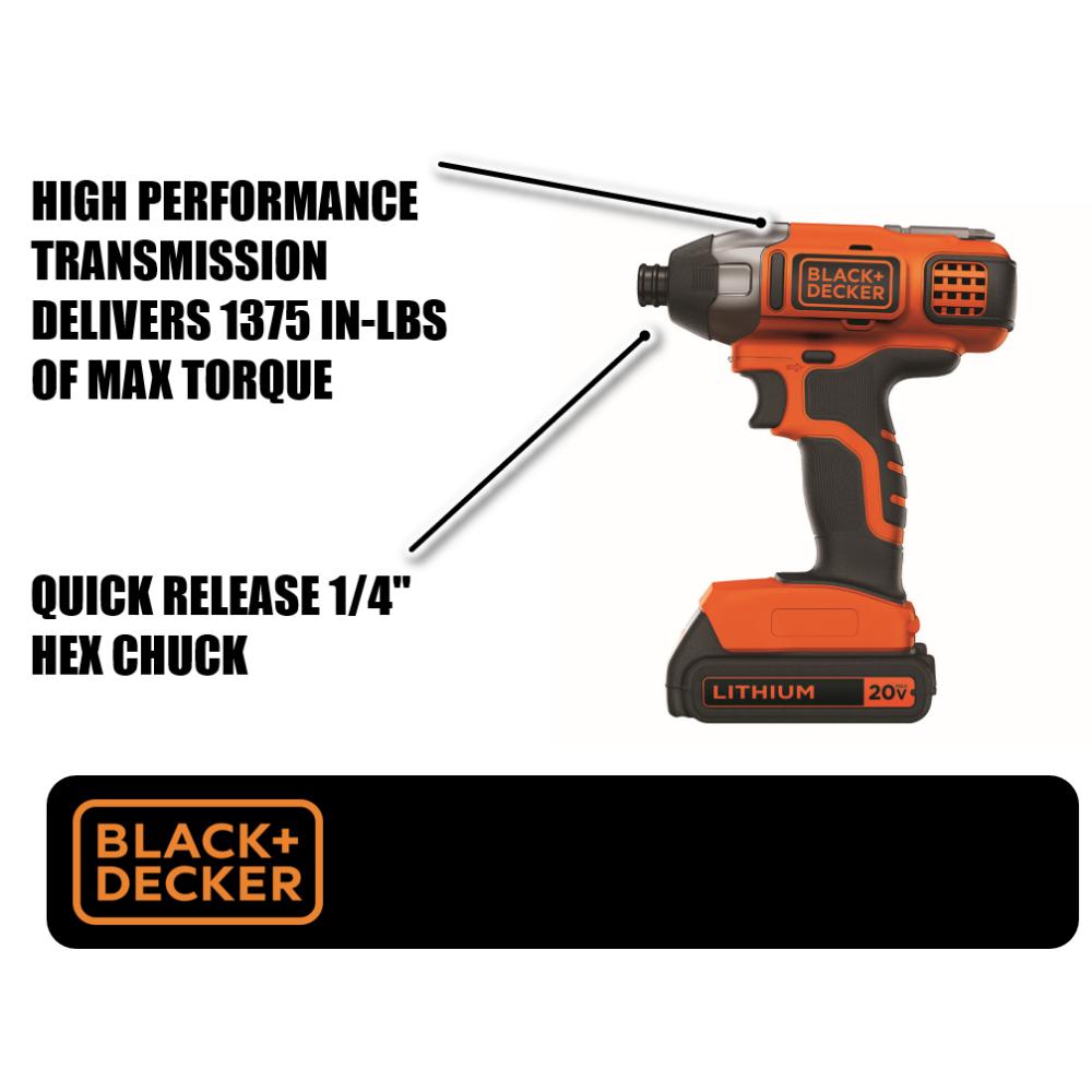 The BLACK+DECKER BDCI20C Cordless Impact Driver is designed with a High Performance Transmission that delivers 1375 in. lbs. of max torque. This Impact driver features a Compact and Lightweight design for ease of use and access to tight areas. For added peace of mind this Impact Driver is backed by a BLACK+DECKER 2 year limited warranty.
