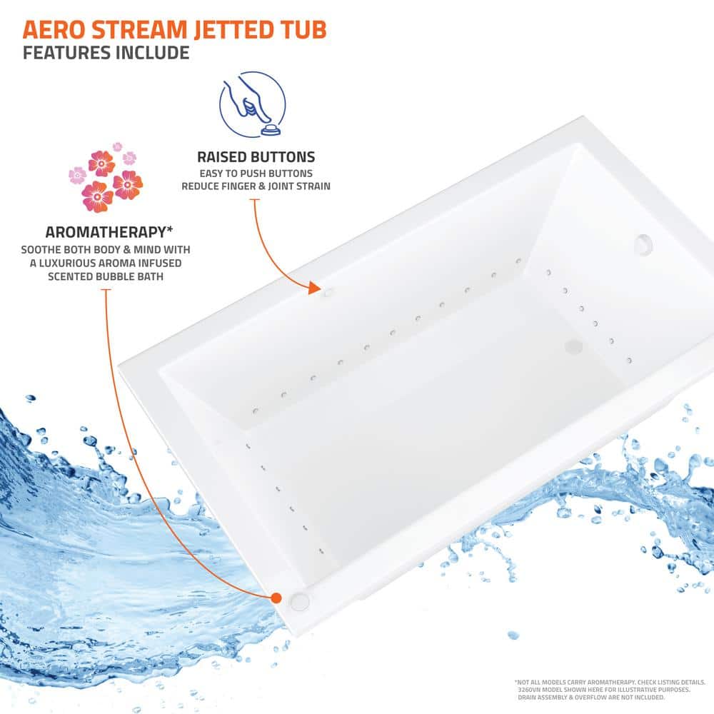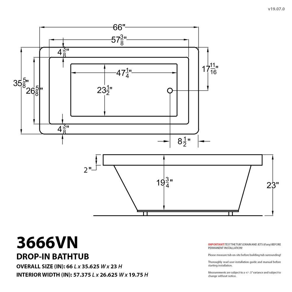 Spacious Design: 66 in. L x 35.625 in. W x 23 in. H with 60-gallon capacity and 15.75 in. soaking depth