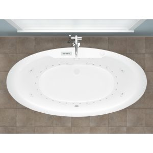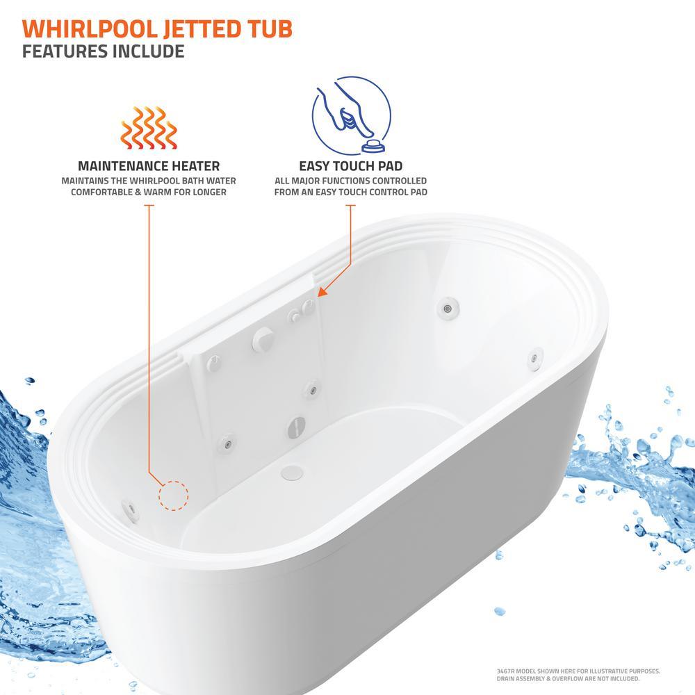 A contemporary oval freestanding whirlpool tub crafted in glossy white acrylic with fiberglass reinforcement. Features 8 hydro-therapeutic jets plus 23 air jets (Fully Loaded configuration) with maintenance heater, aromatherapy, and optional chromatherapy for a spa-like soak at home.