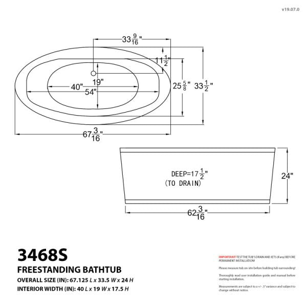 Q: What are the overall dimensions? A: Approximately 67.125 in. L x 33.5 in. W x 24 in. H; interior depth to drain is 17.5 in.