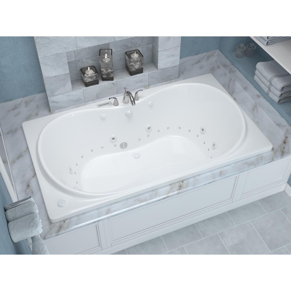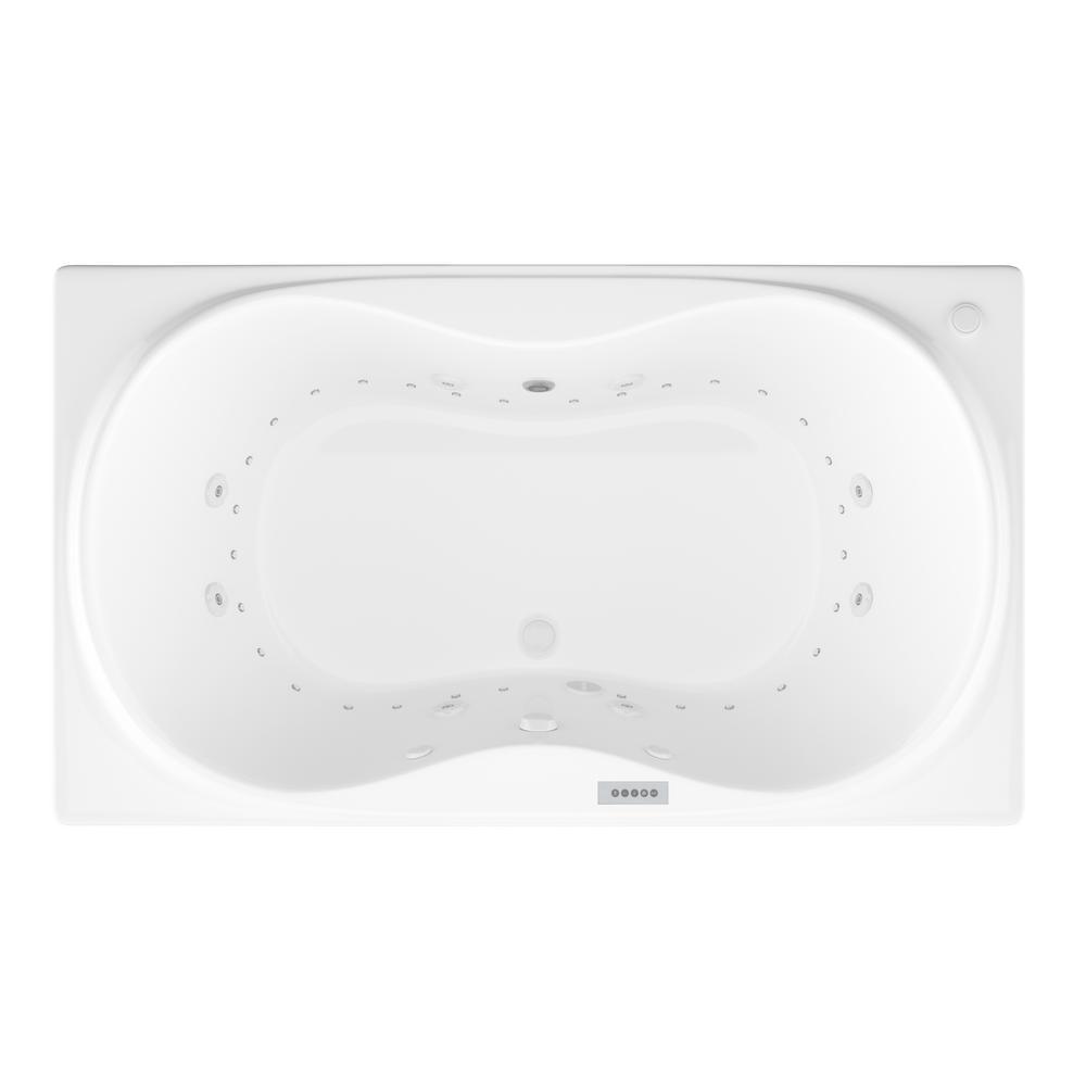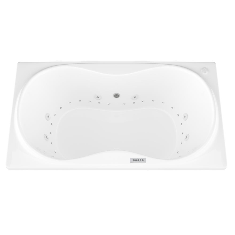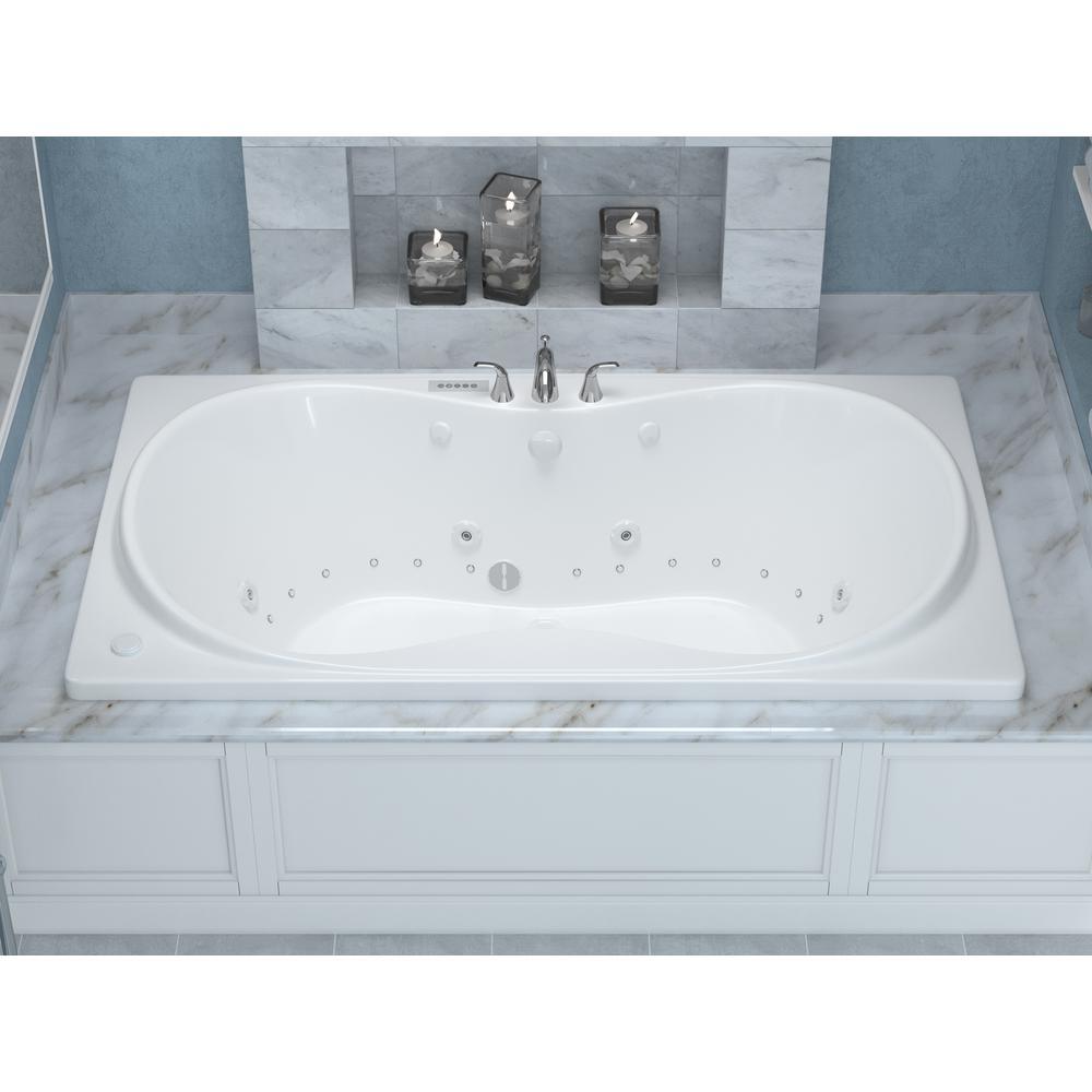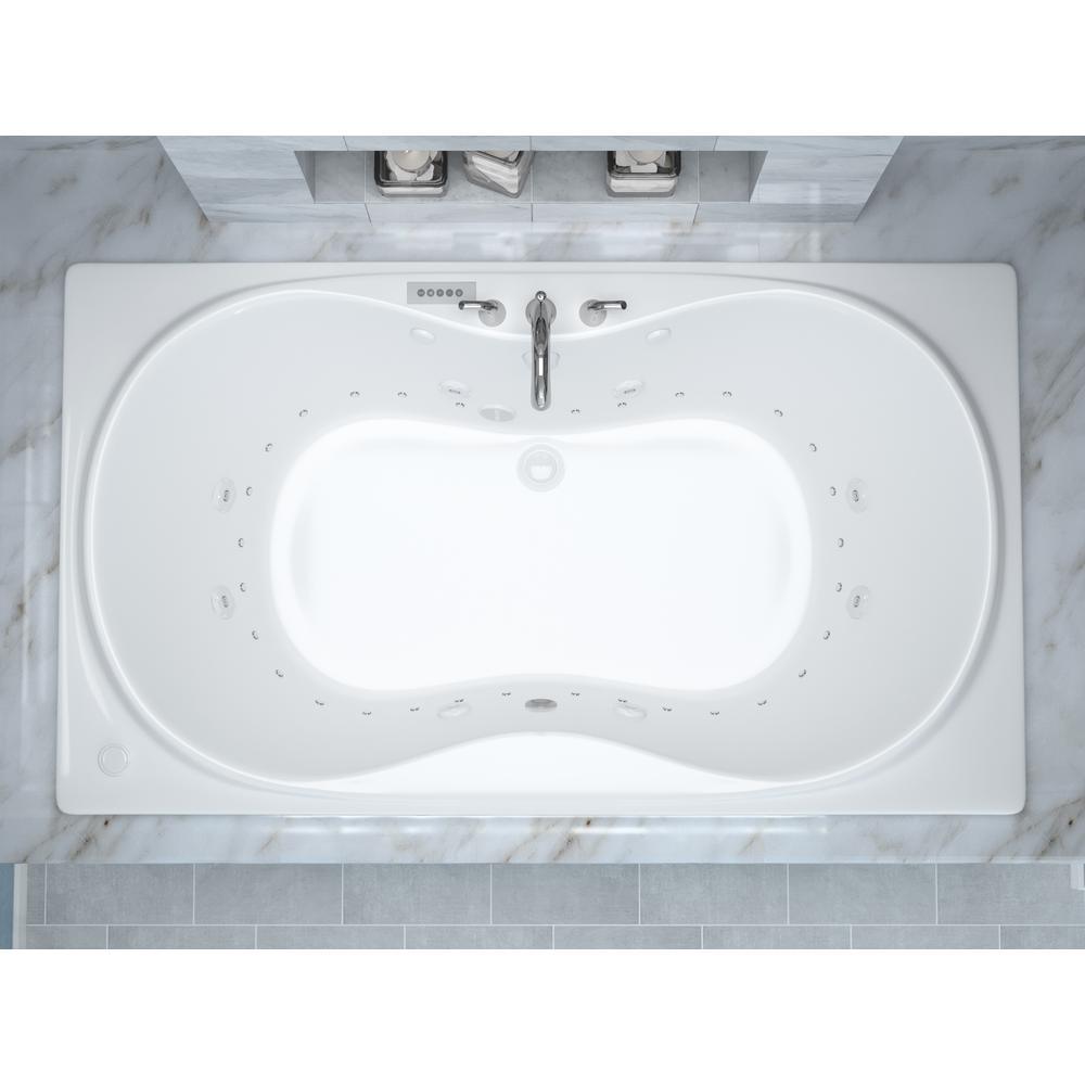 Luxurious dual-jetted drop-in bathtub featuring center drain and an oval-in-rectangle basin. Crafted from glossy white acrylic with fiberglass reinforcement, it delivers both whirlpool and air massage therapies for a true spa experience at home.