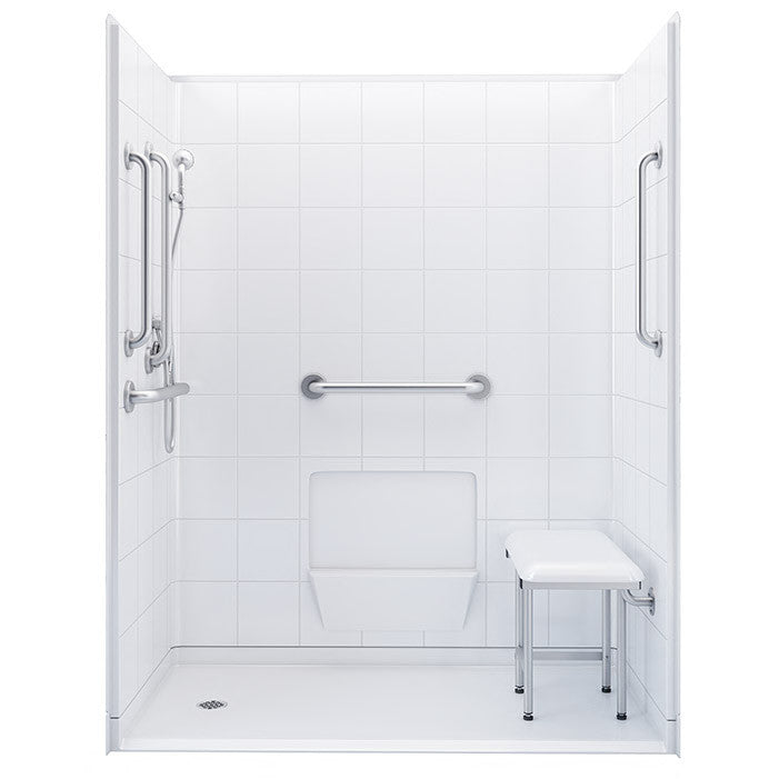 Accessible, curbless shower kit designed to replace a standard 5' tub space. Features a low 1" beveled threshold, left-hand drain, and tile-pattern walls for easy, safe entry and a clean look.