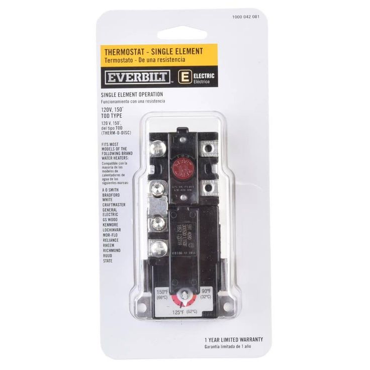 The T-O-D H/HLC Single-Element Thermostat by Everbilt offers an energy-efficient range setting of 90 to 150 degrees Fahrenheit, making it ideal for use in 120-Volt residential water heaters with a single element. It also includes a manual reset switch to prevent overheating. This versatile thermostat can fit most popular brands such as Rheem, Ruud, Richmond, GE, State, Kenmore, Bradford White, AO Smith, American, Craftmaster, Lochinvar, Reliance, GS Wood, Mor-Flo, and Whirlpool. With a temperature-sensitive bi-metal disc that delivers a snap action to the contacts, this thermostat provides a reliable performance at high electrical loads. Made with durable metal and plastic construction and listed for safety by UL and CSA, it also comes with a 1 year limited warranty.