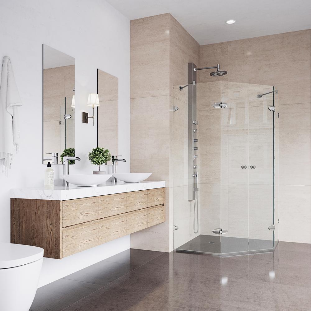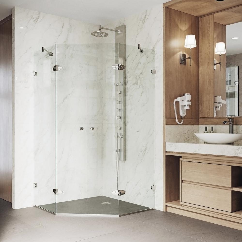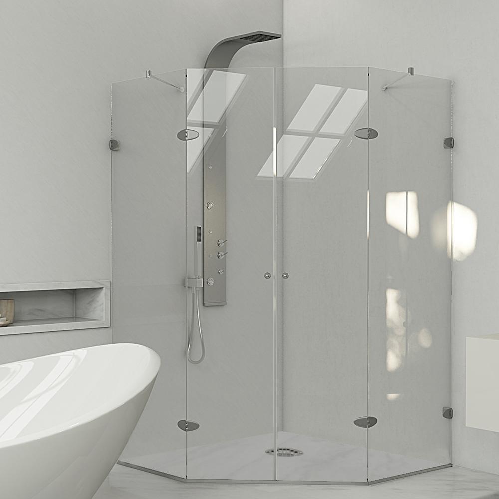 FRAMELESS NEO ANGLES: Unique shower enclosure has 135 degree corners for functionality and visual appeal