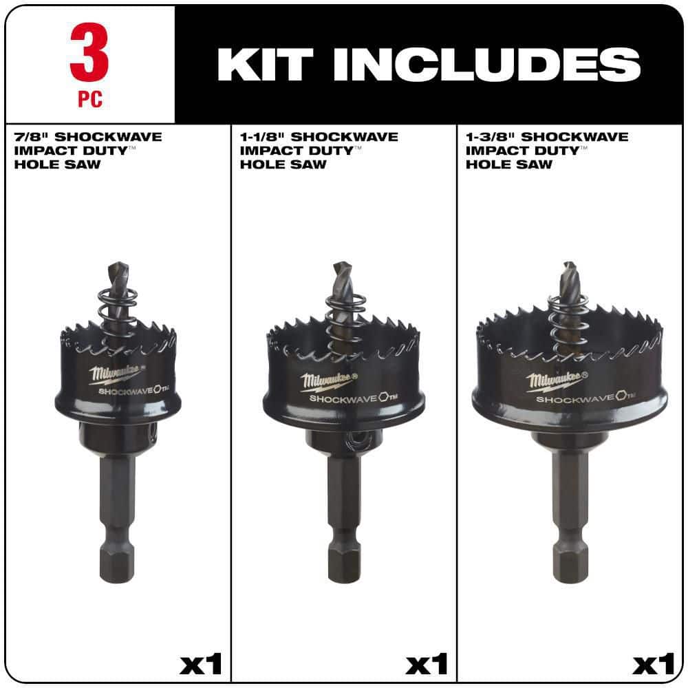 Assorted Sizes Included: 7/8 in., 1-1/8 in., and 1-3/8 in. hole saws with arbor and pilot bit