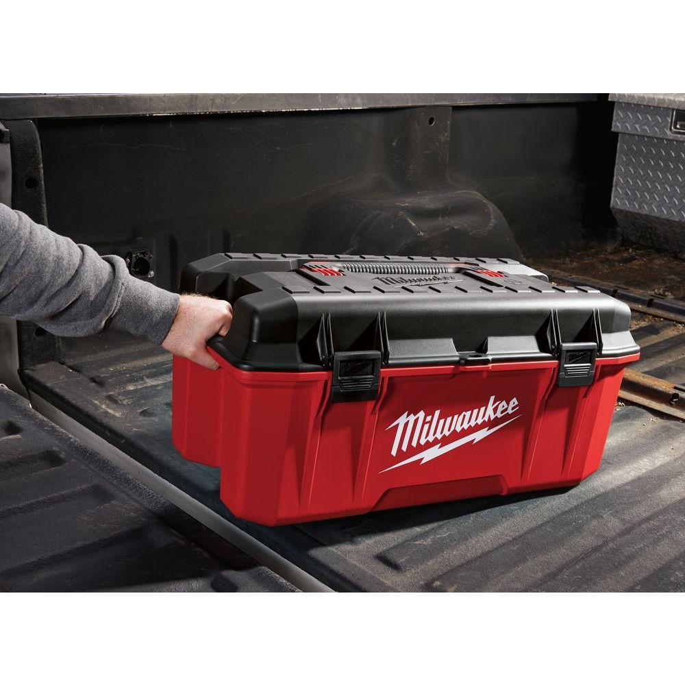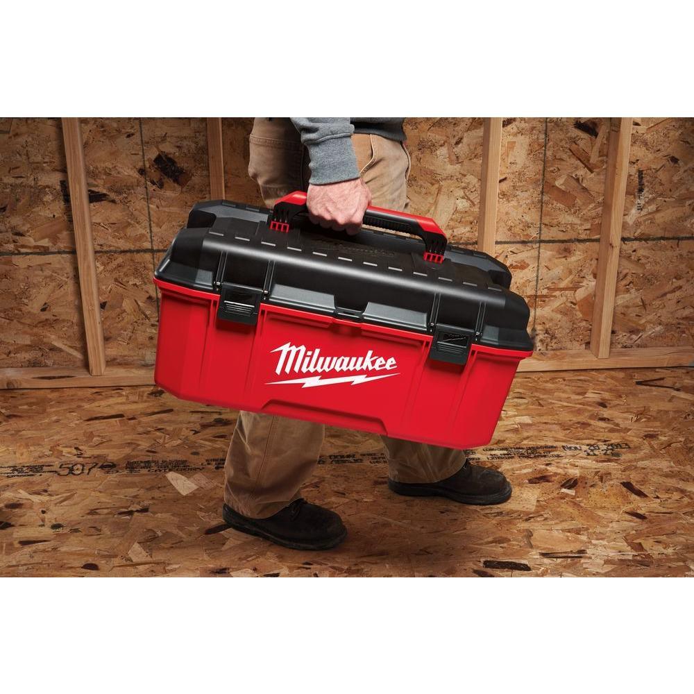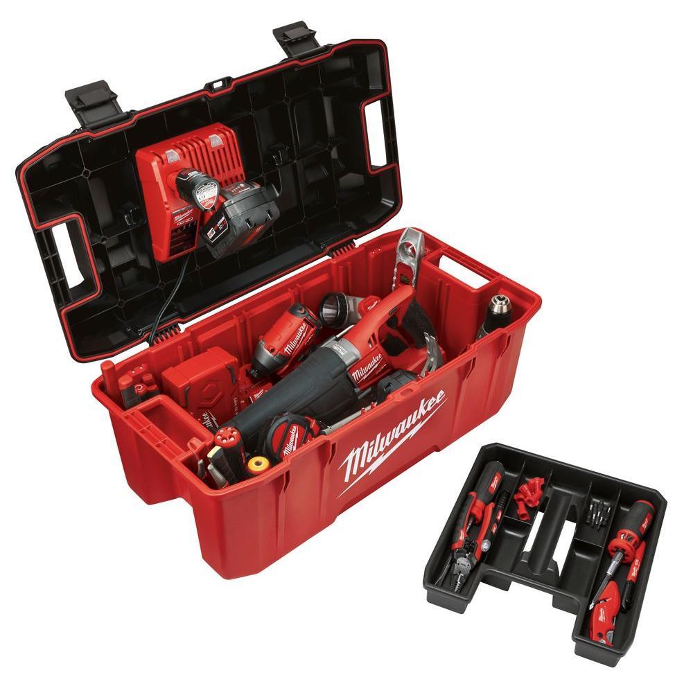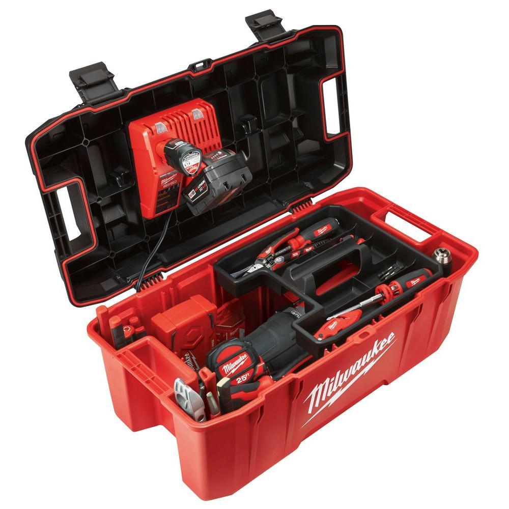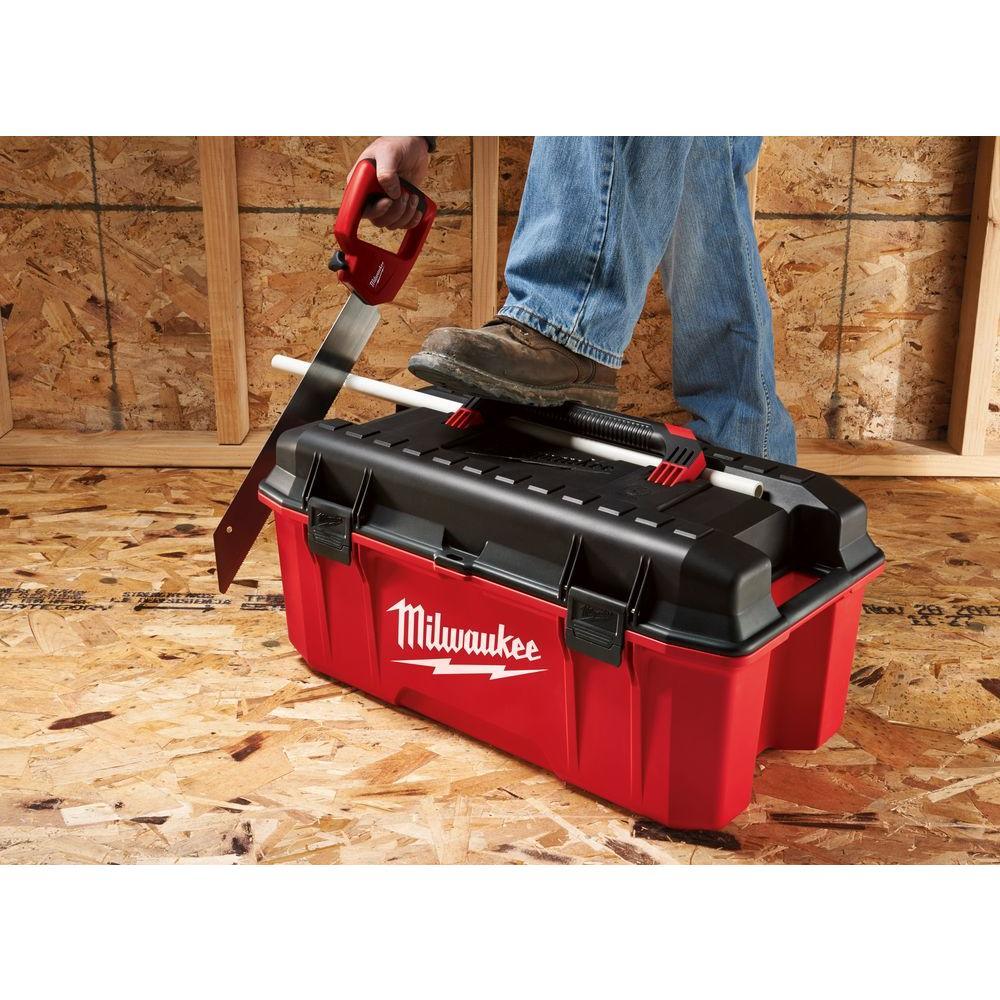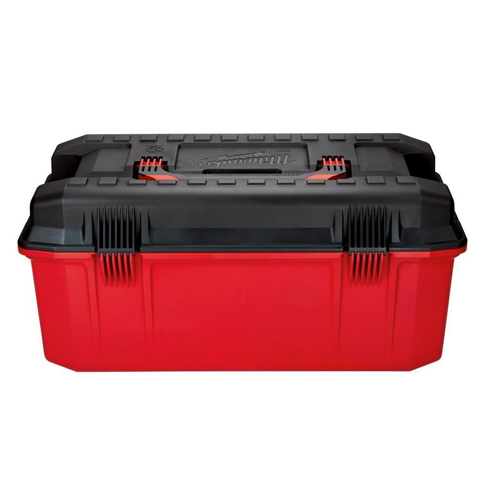 The Milwaukee 26 in. Tool Box is a great way to store and transport your tools. At a 3400 cu. in. capacity and the strength to hold up to 200 lbs., there is little this tool box can't handle. Impact Resistant Material, Buttressed Hinges and Hi-Impact Reinforced Corners combine to create a box that withstands up to 1000 drops. A Lockable Lid with Integrated Weather Seal Gasket keeps your tools safe, secure and dry. Overmolded Handle and Pass Through Side Handles make this tool box easy to transport. Included tool tray helps you organize small tools and is easily removable. Clamping Cut Grooves help secure any small diameter materials for ease of cutting. Screw Bosses under the lid provide a method of mounting charges or any other items, with a common screw. The Milwaukee 26 in. tool box is extremely durable and exclusive to The ARB775W.