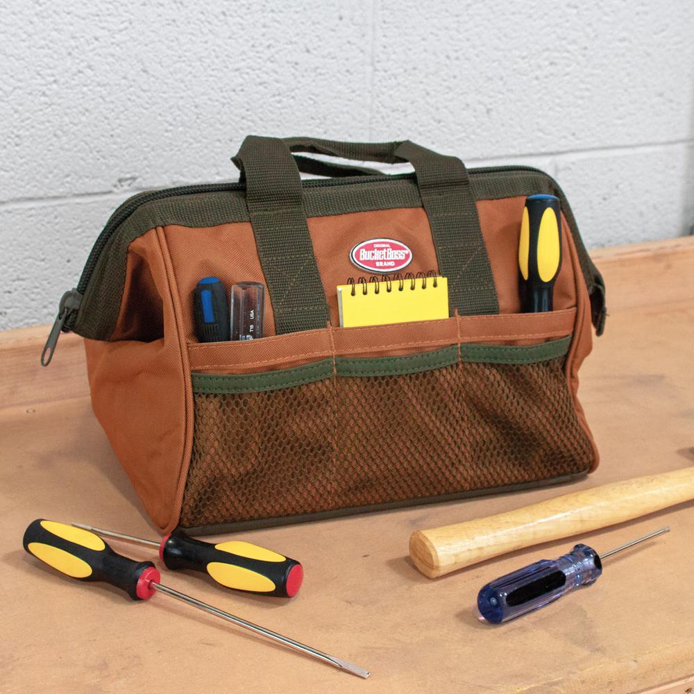 The Gatemouth 13 in. is ideal for the DIY'er and is perfect for holding small hand tools. Made of 600D poly material, this tool bag has 3 exterior pocket and 3 mesh exterior pockets. The carrying handle makes it easy to transport your tools while on the job.