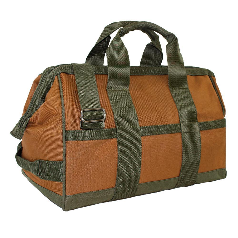 The Gatemouth 16 in. Tool Bag is ideal for the DIY'er and is perfect for holding small hand tools. Made of poly ripstop/600D poly material, this is the bag with the super-wide "Dr.'s Bag" opening. There are 17 pockets to hold tools or other items in place. The bottom of the bag is reinforced with padded ripstop material. There are now side pull handles so you can pull your bag across a surface. The padded shoulder strap makes it easy to transport your tools while on the job.