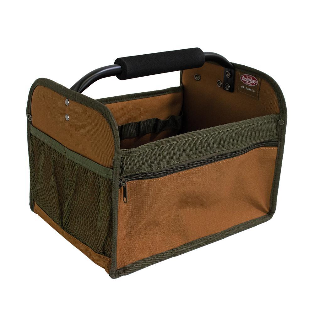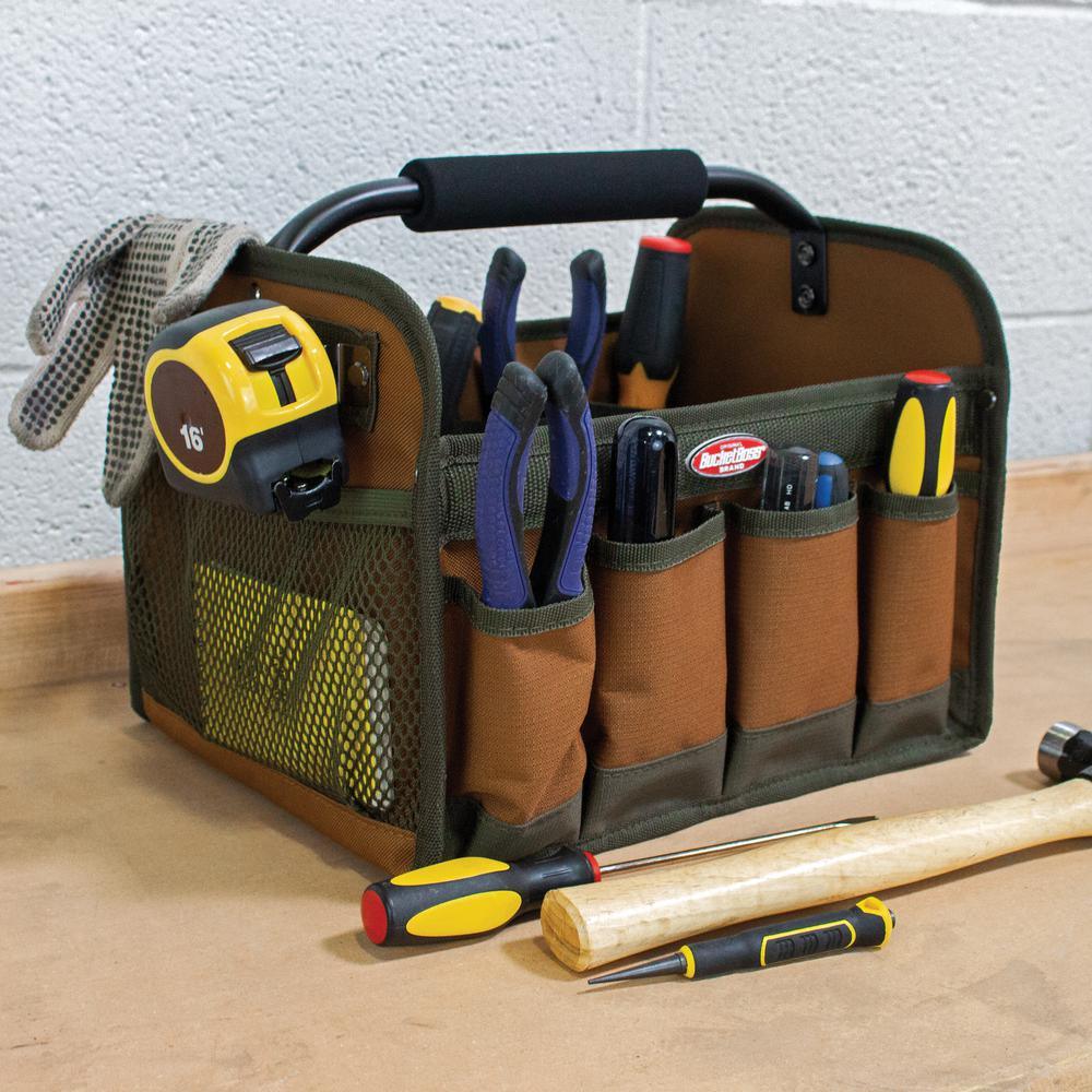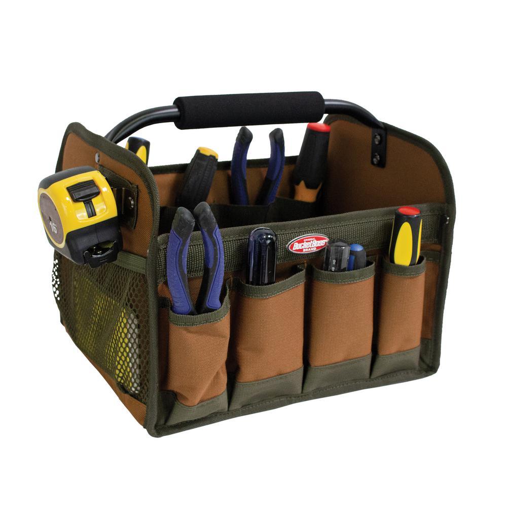 The Bucket Boss Gatemouth 12 in. Hard Tote was made of not just holding tools, but for use with crafts or cleaning supplies. We constructed this with the same poly ripstop/600D poly material as our other tool bags because we wanted to make this tote durable. Built with several pockets style (4 open, 3 mesh and 1 zipper) and 12 loops, there should not be any problems with holding small parts or tools. There is also a metal tape clip included and a foam rubber grip on the steel handle for comfort when you carry it.