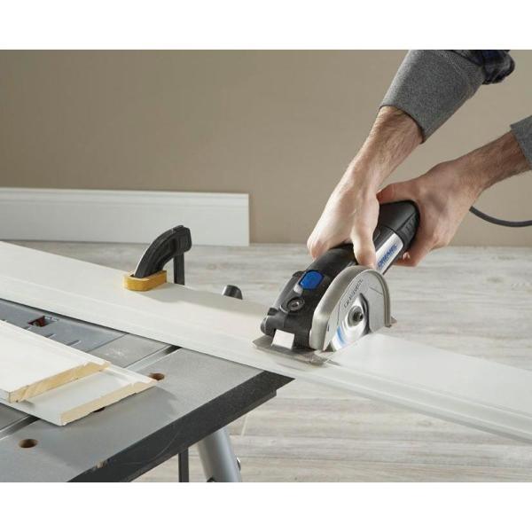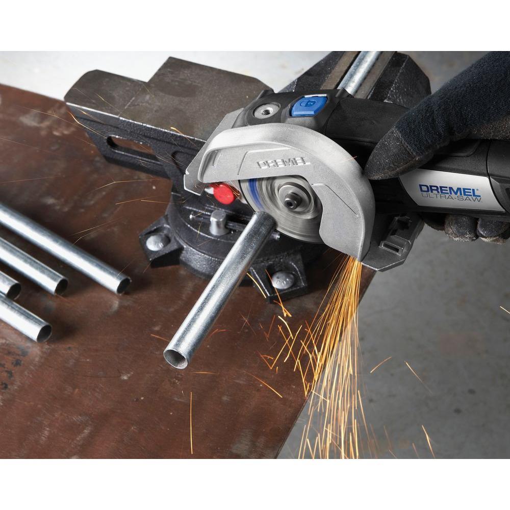 The Dremel Ultra-Saw Tool Kit does everything the Dremel Saw-Max can do, and more. With a 7.5 Amp motor and durable drive train, the Ultra-Saw delivers more power for making long cuts. A metal foot and guard resist the heat generated by heavy-duty jobs like grinding and cutting metal. Large, 3.5 in. and 4 in. cutting wheels provide fast cutting speeds and improved performance in a wide variety of materials. Plus, with exclusive accessories, the Ultra-Saw can also perform surface preparation tasks like removing paint, rust and thin-set mortar.