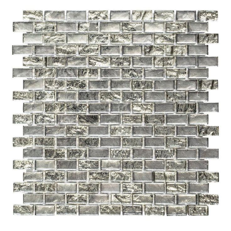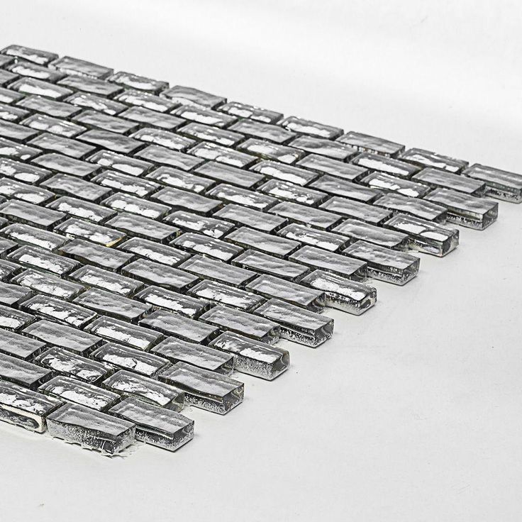 A metallic silver-grey glass mosaic in a mini brick pattern with a glossy, textured finish. Ideal for backsplashes, bathrooms, and feature walls, offering a sparkling, contemporary look. Use with white polymer-modified thinset for best results.
