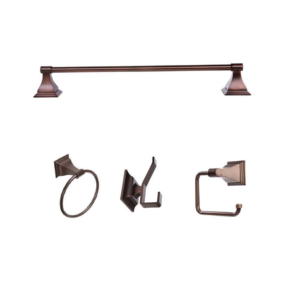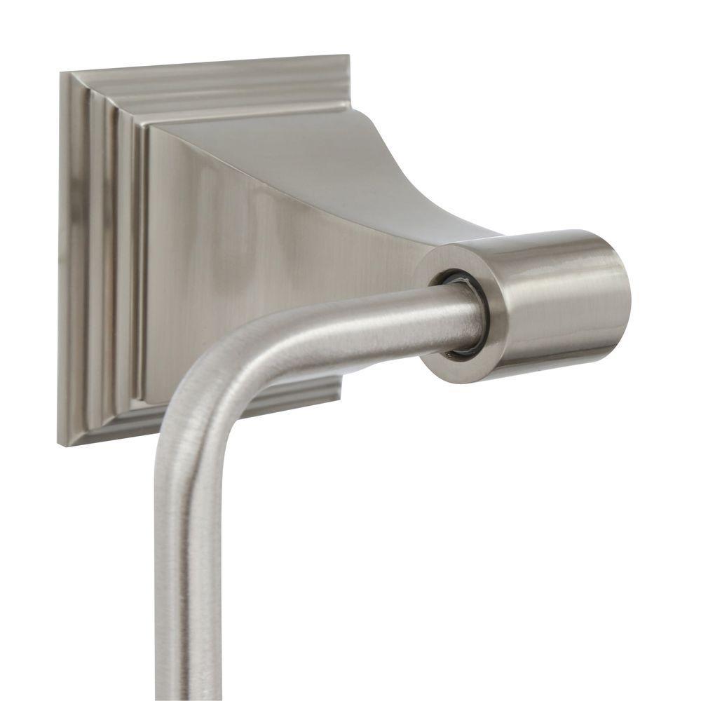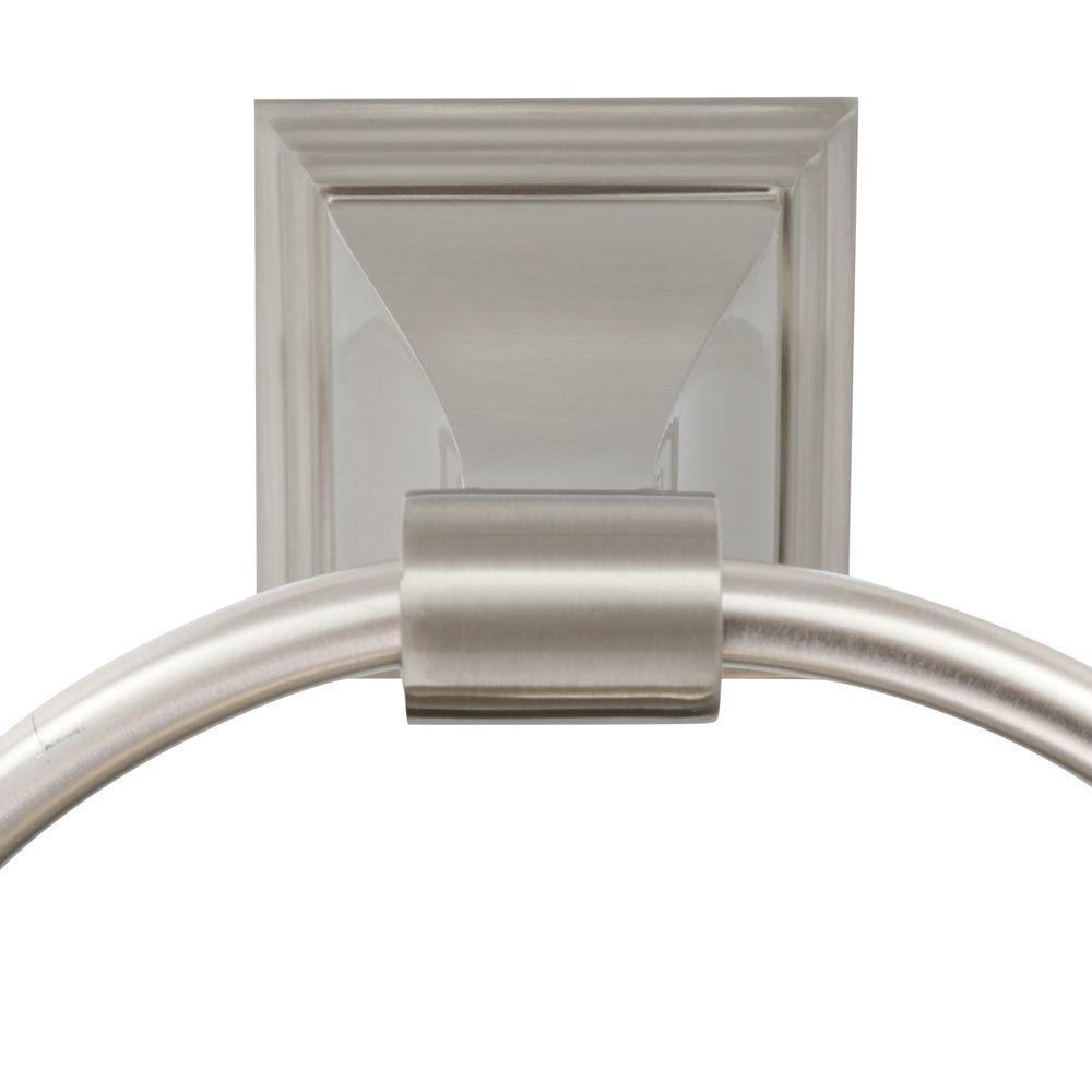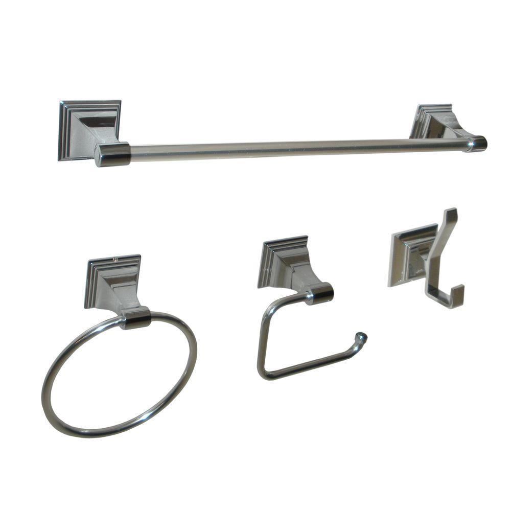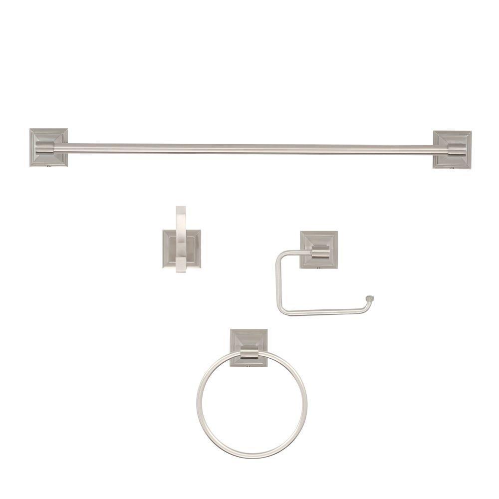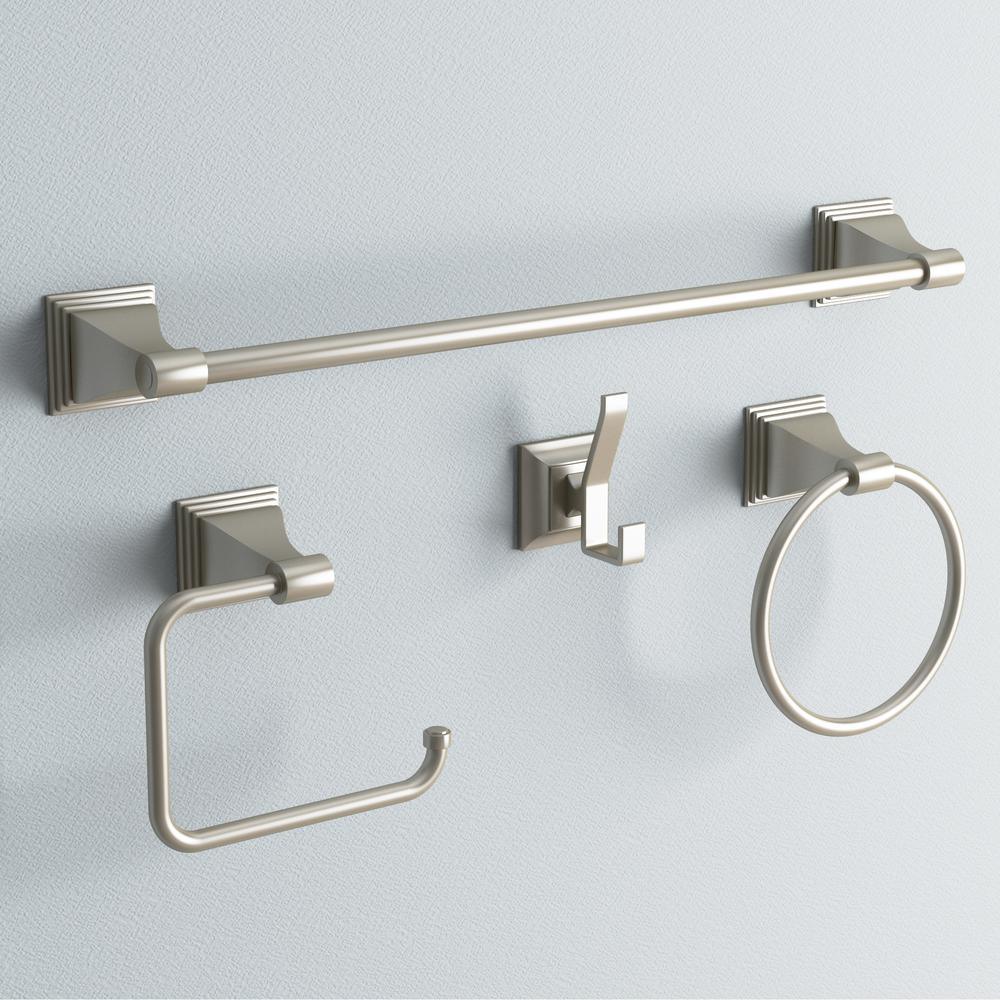 With clean, sharp lines, the ARISTA Leonard Collection 4-Piece Bathroom Accessory Set brings a touch of modern flair to any bathroom. Crafted from durable zinc aluminum, the set includes a towel bar, toilet paper holder, towel ring and robe hook in smooth, elegant satin nickel to complement a range of popular bath hardware finishes. Concealed mounting hardware is included to assist with a quick and clean installation.