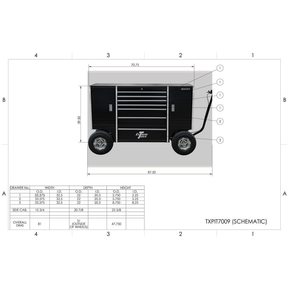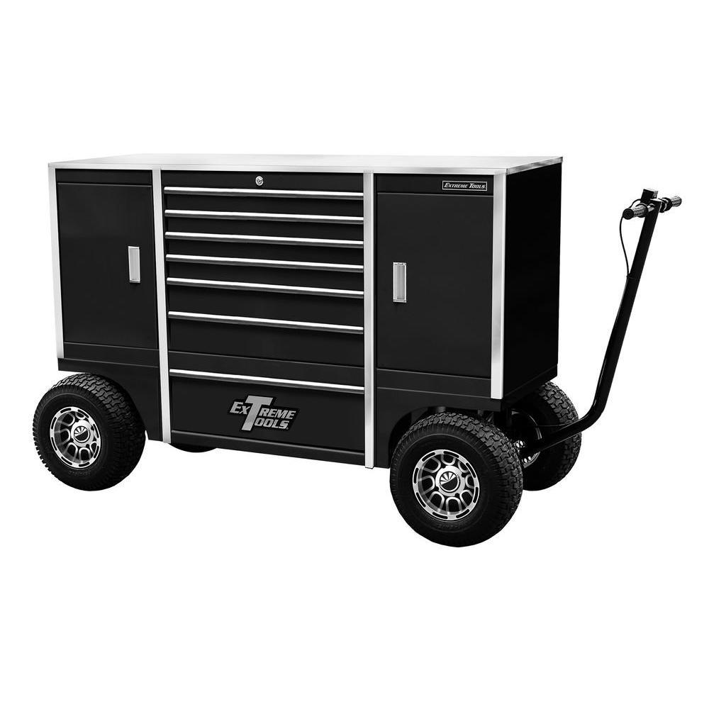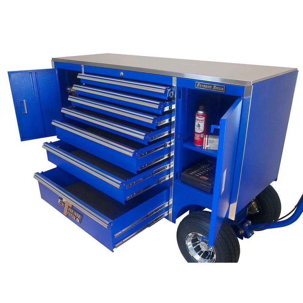 The Extreme Tools TX Series 48 in. x 70 in. x 30 in. Steel 7-Drawer Pit Box in Blue is designed to be your workshop's most valuable addition. With a portable design, it can be moved around for ultimate customization. Excellent for heavy use, it has a 14-Gauge steel construction to provide increased durability. This tool storage system has a textured gloss powder coat finish that features scratch and chemical stain-resistant properties, which protect it from weathering and will help keep your tool chest looking new. The 2 cabinets feature an adjustable shelves for ultimate customization. It is made with 7-drawers 4 small, 2 medium and 1 large and features a total holding capacity of 37,503 cu. in., offering the ideal storage solution for all of your tools. Designed to handle heavy loads, this Extreme Tools mobile workbench features ball bearing slides that can hold up to 100 lbs., great for accessing all your tools and equipment. This Extreme Tools high-quality mobile workbench comes with a tubular coded lock and key system, which provides peace of mind when your tools are not in use. It features 4 casters and a T-shaped handle for easily moving the unit. Keep your workshop neat and organized with the Extreme Tools TX Series 48 in. x 70 in. x 30 in. Steel 7-Drawer Pit Box in Blue.