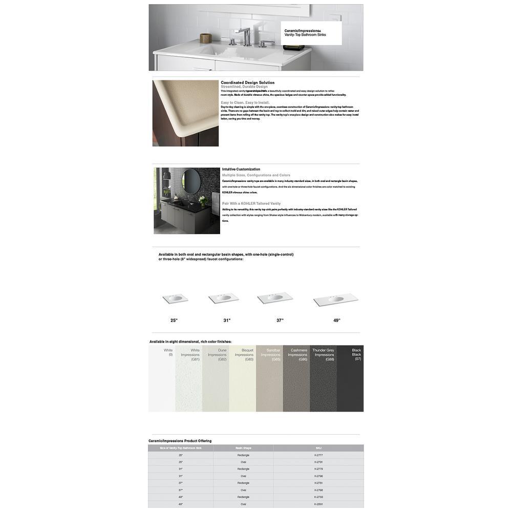 This integrated vanity top and sink offers a beautifully coordinated and easy design solution to reflect your unique bathroom style. With one-piece, seamless construction to simplify cleaning, Ceramic/Impressions vanity-top sinks are available in an array of dimensional color finishes that evoke a rich, spa-like feeling. This top/sink pairs perfectly with the industry-standard vanity sizes of the KOHLER Tailored vanity collection, and the new dimensional finishes are color matched to existing KOHLER vitreous colors.