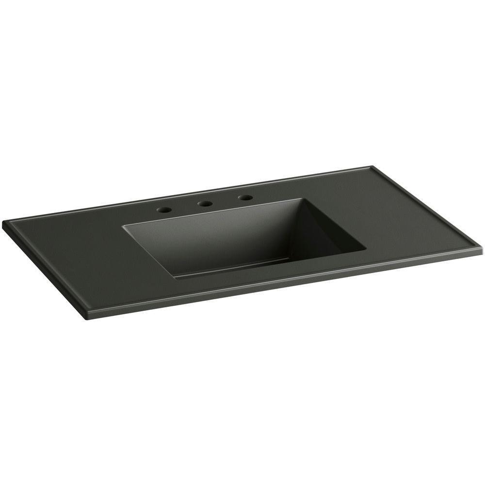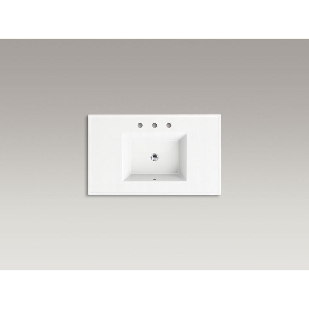 This 37 in. integrated vanity top and sink from KOHLER offers a beautifully coordinated and easy design solution to reflect your unique bathroom style. With one-piece, seamless construction to simplify cleaning, Ceramic/Impressions vanity-top sinks feature a raised edge to keep water contained and prevent toiletries from rolling off the side. This unit is fashioned with three predrilled holes to accommodate your favorite 8 in. widespread faucet (sold separately) while the White Impressions finish evokes a rich, spa-like feeling that will redefine your powder room aesthetic. It pairs perfectly with a 36 in. vanity cabinet from the KOHLER Tailored collection, and the dimensional finish is color-matched to existing KOHLER vitreous colors.