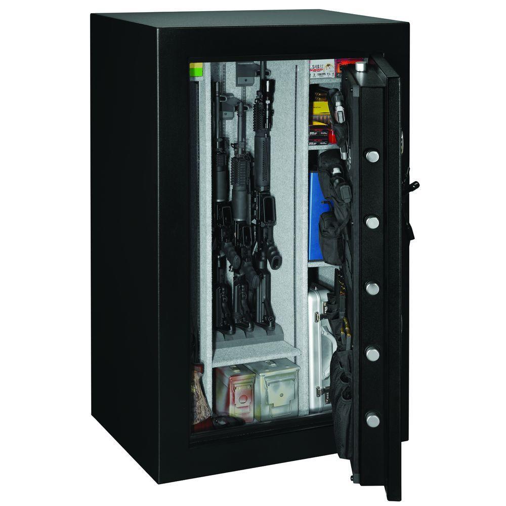 This Stack-On 20 Gun Tactical Fire Resistance Safe holds 4 tactical weapons and 16 long guns or valuables. It has a reinforced steel door filled with fire retardant material. Door stripping expands and seals the door when exposed to fire. This safe is available in a matte black color with silver/gray accents.