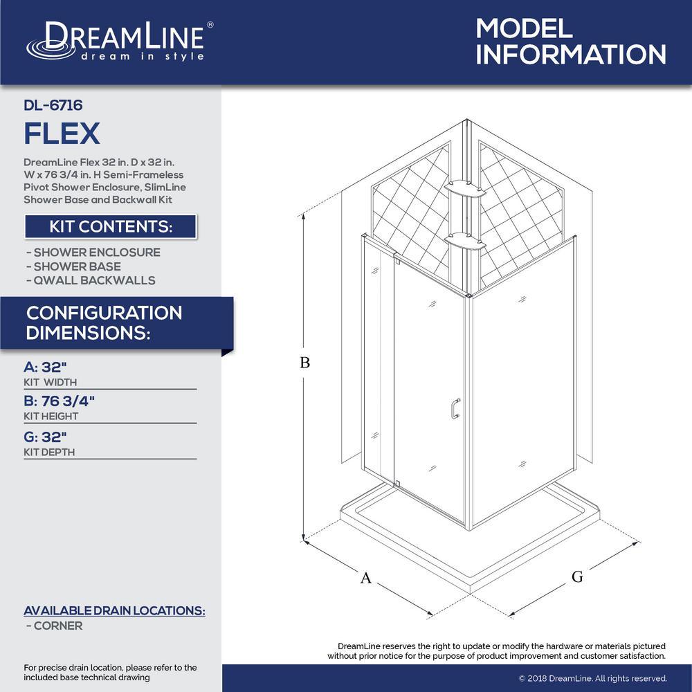 Complete DreamLine FLEX shower solution featuring a framed pivot door, SlimLine base, and Q-Wall backwalls. Adjustable design fits out-of-plumb walls, with slip-resistant base and certified tempered glass for durability and safety.