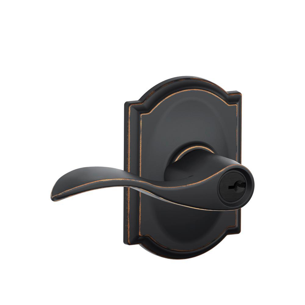 The Schlage Accent Aged Bronze Keyed Entry Door Lever with Camelot Trim is perfect for use on exterior doors where extra security is needed. The Accent lever features an elegant wave-like design that effortlessly matches any room's style, while the Camelot trim’s scalloped architectural details make any room charming and approachable. Its aged bronze finish features warm, copper tones that break through its darker, aged exterior. The lever unlocks when the door is opened from the inside, allowing you to leave quickly and conveniently and re-enter easily. Plus, it was designed and tested with strength and durability in mind.
