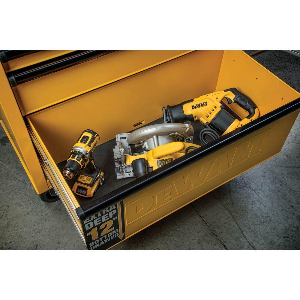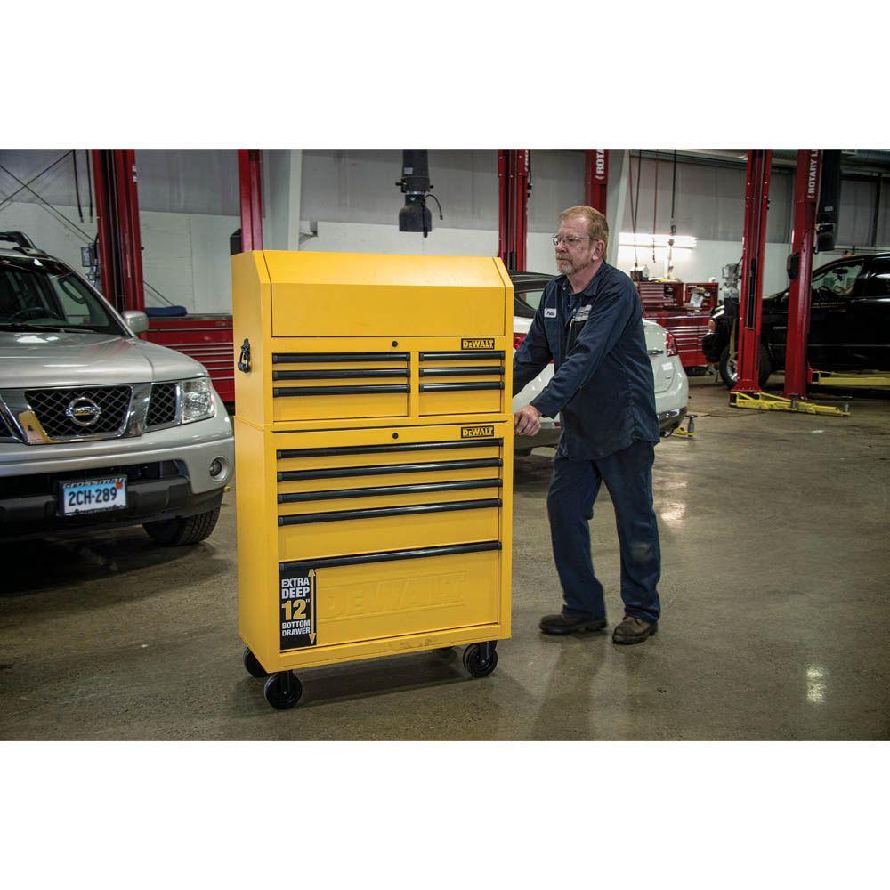 A rugged, 36-inch DEWALT rolling tool chest and cabinet combo built from heavy-duty metal for professional storage. Eleven drawers provide organized capacity, while the rolling base makes it easy to move tools around the shop or garage.