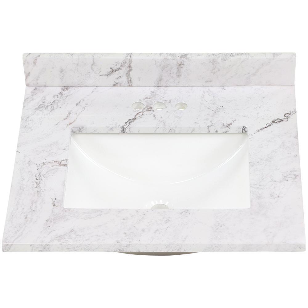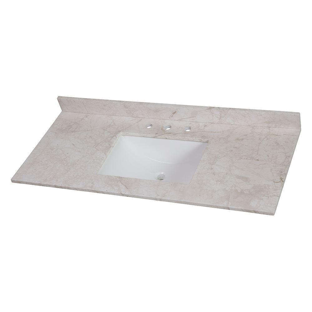 The Stone Effects 49 in. W Vanity Top in Rustic Gold features natural stone-like surface patterns that instantly add elegance and beauty to your bathroom. Coated with Diamond Shield, a surface coating that makes the vanity top resistant to stains, bacteria, mold and mildew; this durable vanity top is pre-attached to a white bowl for your convenience. The vanity top's 3-1/2 in. backsplash helps protect the wall and back of your cabinet against splashes and spills.