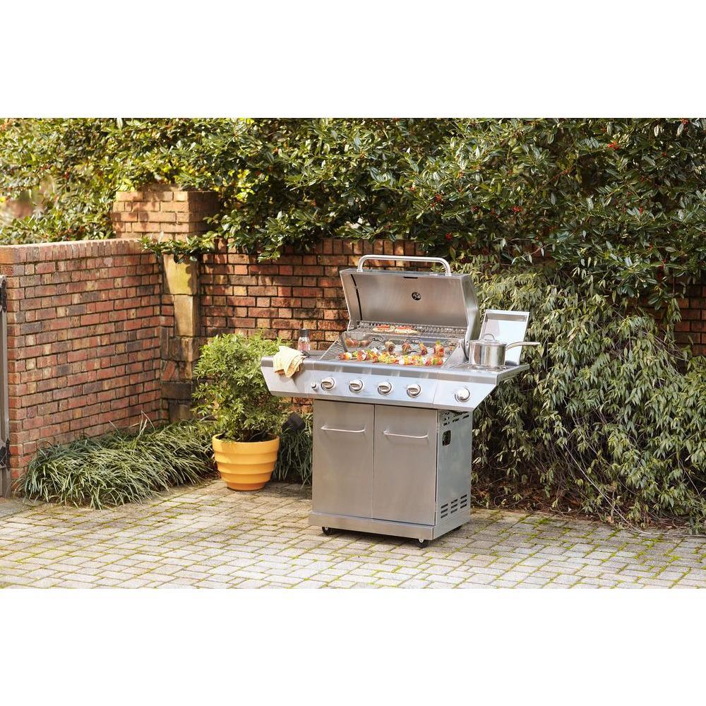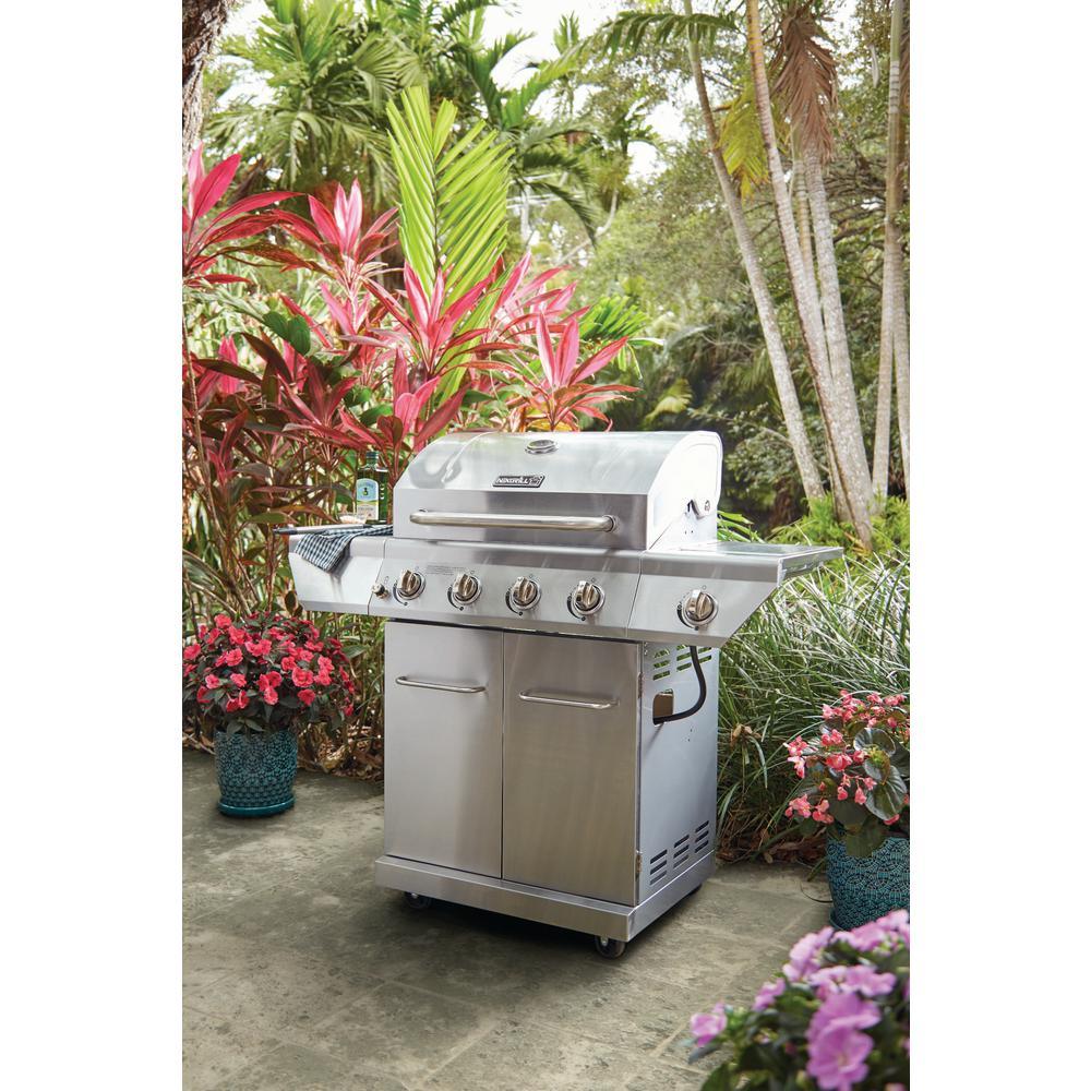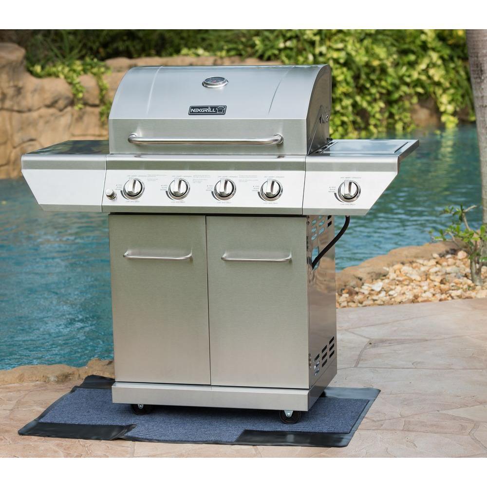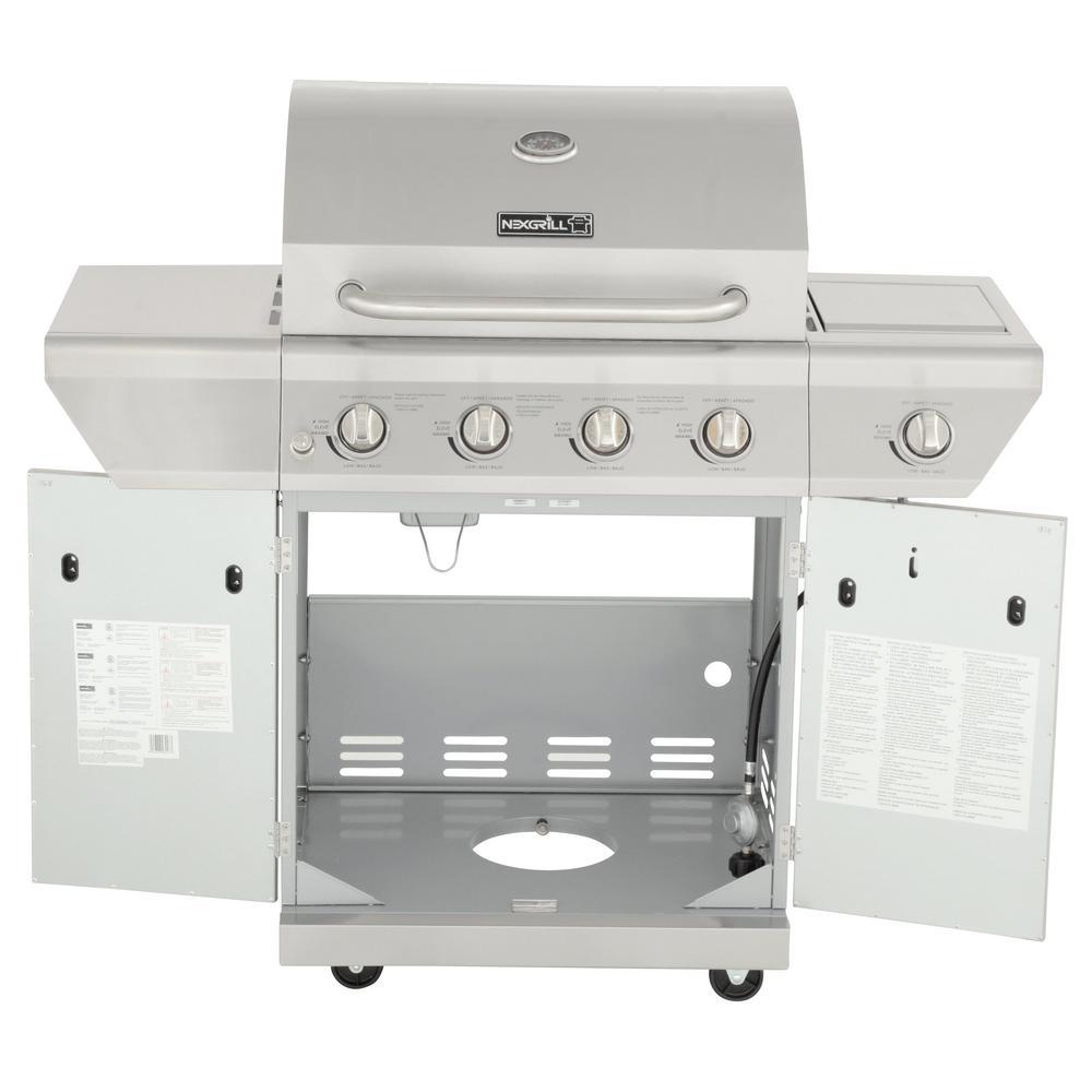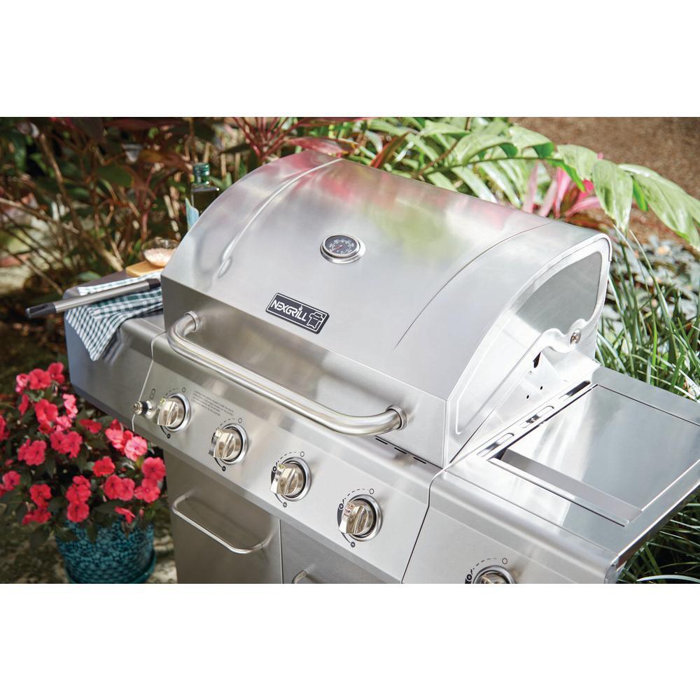 This Nexgrill 4-Burner Stainless Steel Propane Gas Grill boasts 626.8 sq. in. of total cooking space with four main burners and one side burner, supplying 60,000 BTUs of flame-roasting energy. The main grill deck is equipped with stainless steel-wrapped cooking grids featuring 7 mm crossbars, under which lies the Even-Heat Cooking System that distributes uniform heat throughout the firebox. Angled flame tamers deflect heat, prevent flare-ups and transform drippings into flavor vapors that infuse foods with a distinctive smoky taste. An electric ignition allows it to fire up instantly and an upper-level warming rack provides a place to heat buns and keep foods toasty. Casters make it easily portable and the built-in thermometer enables precise temperature regulation.