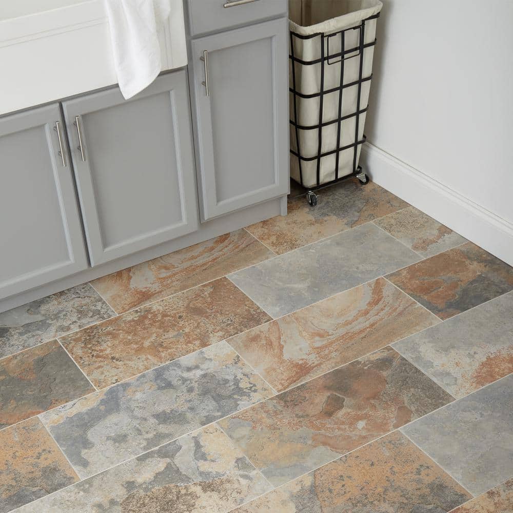 Stone-Look Design: Slate-inspired pattern with gray, rust, and blue-green tones for rustic-modern spaces.