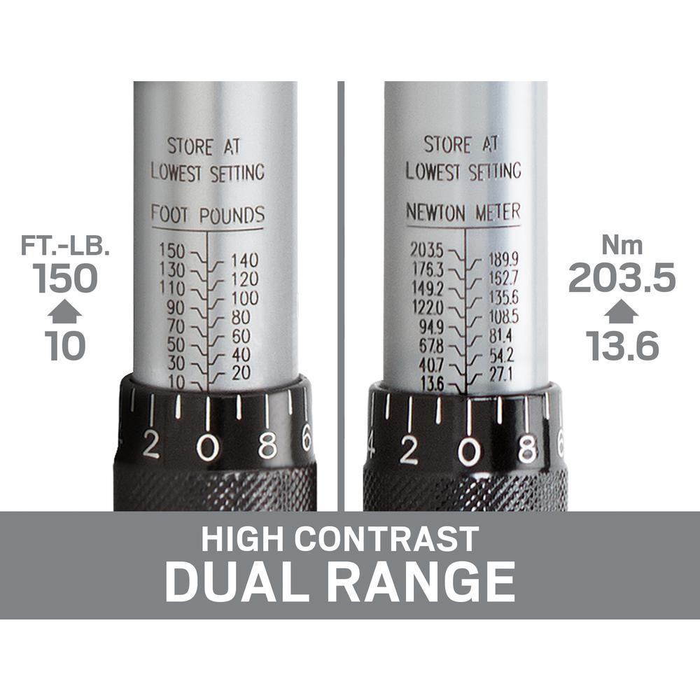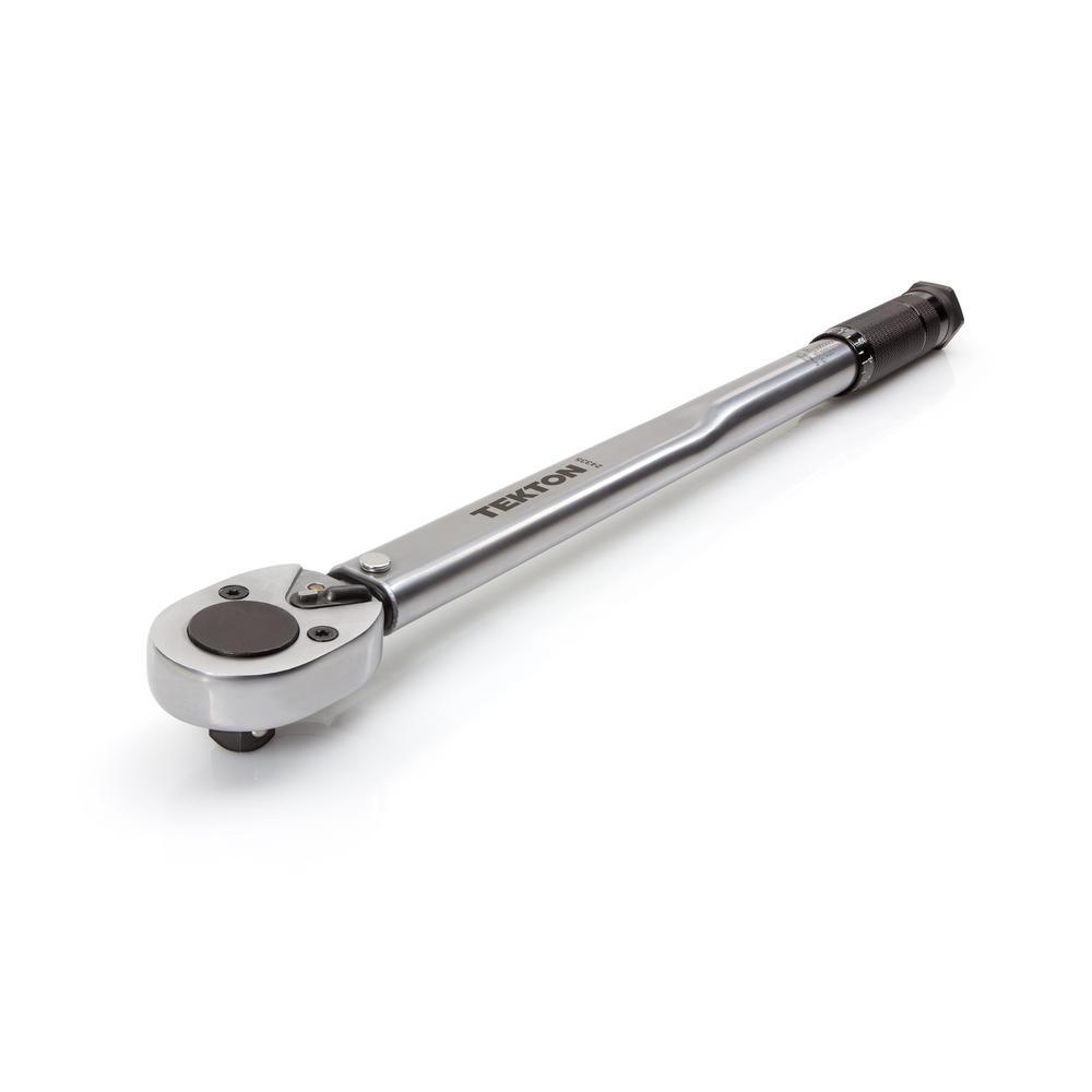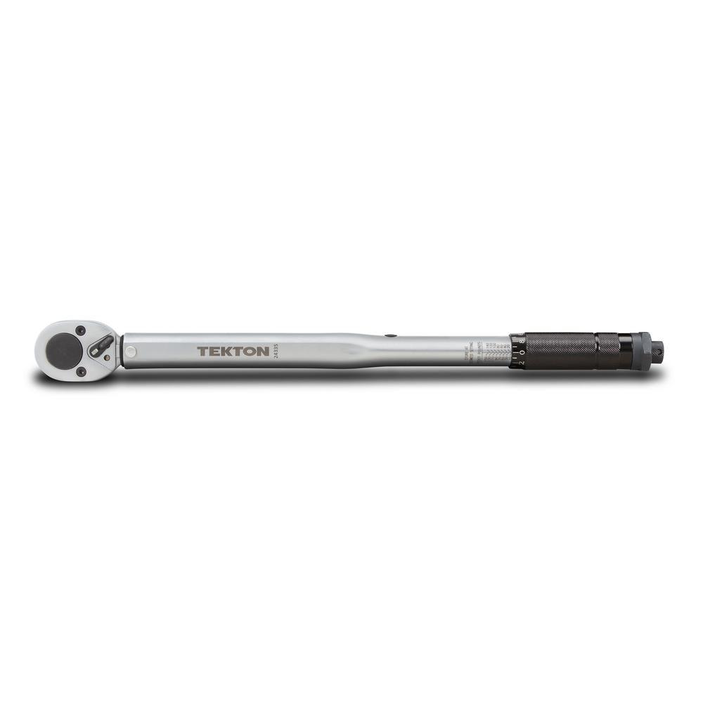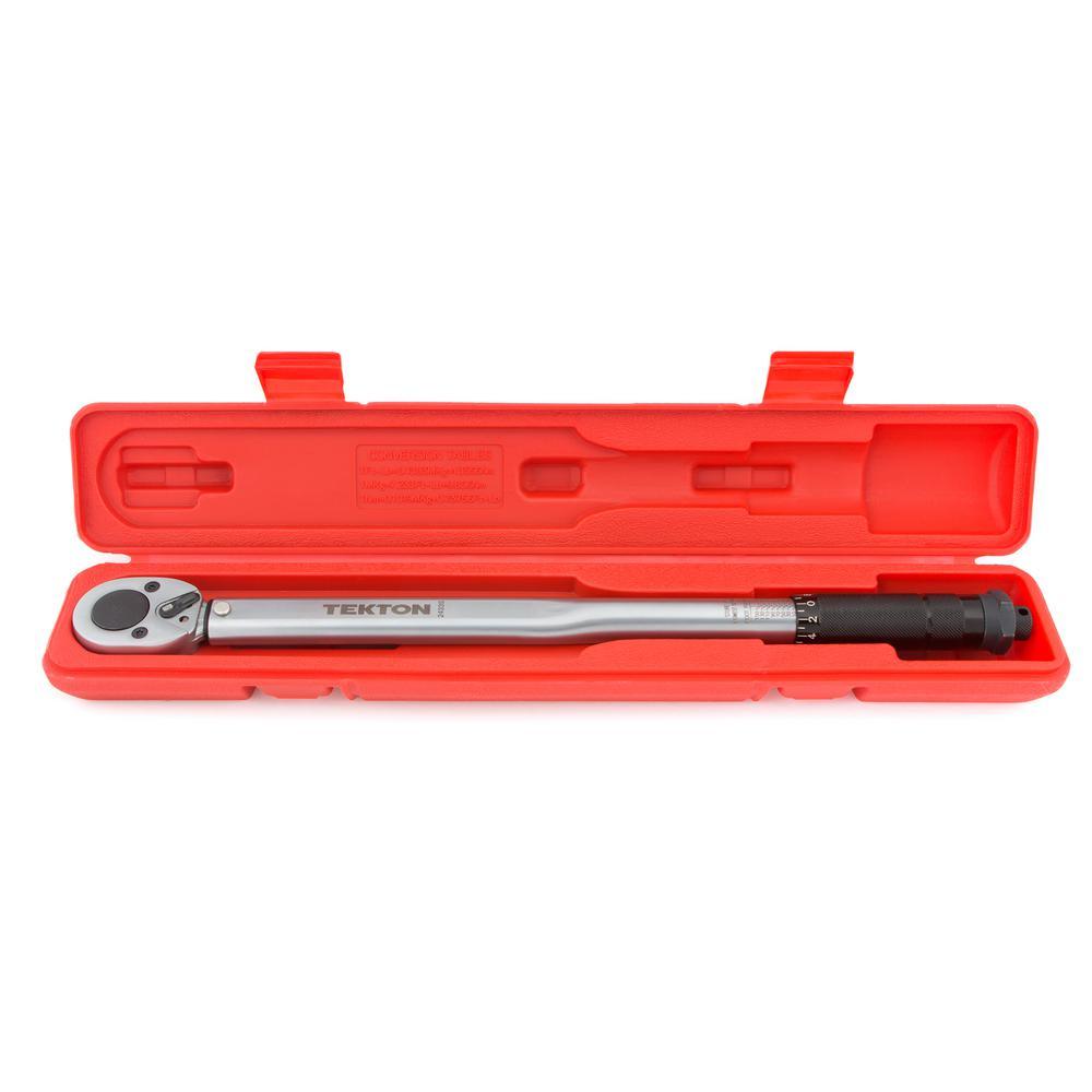 Calibrated to an accuracy of +/- 4%, the TEKTON 1/2 in. Drive Click Torque Wrench lets you work with confidence, eliminating guessing and the common tendency to overtighten fasteners. Correctly tightening fasteners to vehicle or equipment torque specifications ensures parts are properly secured without being damaged. Simple and easy to use, this wrench has a reversible ratcheting head that drives fasteners in both directions and measures torque in the clockwise direction. To measure torque, set the desired value on the handle scale (foot pounds or Newton meters) and begin tightening the fastener. When the preset torque value is reached, a reliable mechanical operation inside the handle produces a click you can hear and feel, alerting you to stop applying force. Built for consistent performance and years of dependable service, the mechanical design does not need batteries and the all-steel construction has no plastic parts to break or wear out. Important: This wrench is shipped pre-calibrated and ready to use. To help maintain calibration, store at its ARB265Wt setting of 10 ft./lb. (13.6 Nm) when not in use. Be sure to read and understand the operator's manual, including all safety information, before first use.