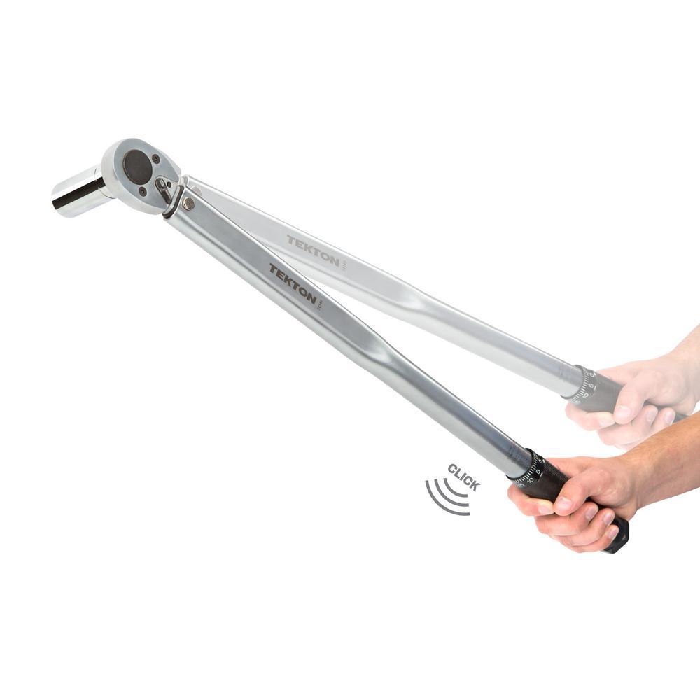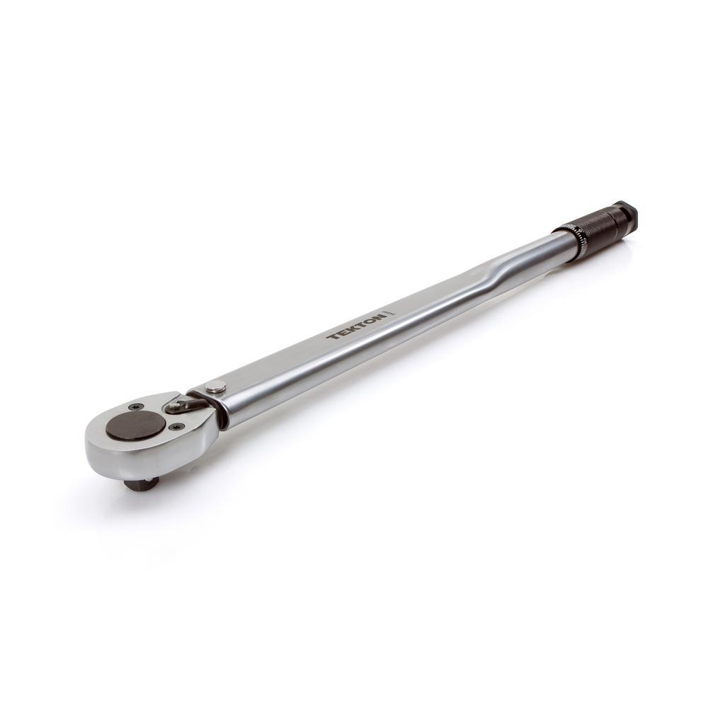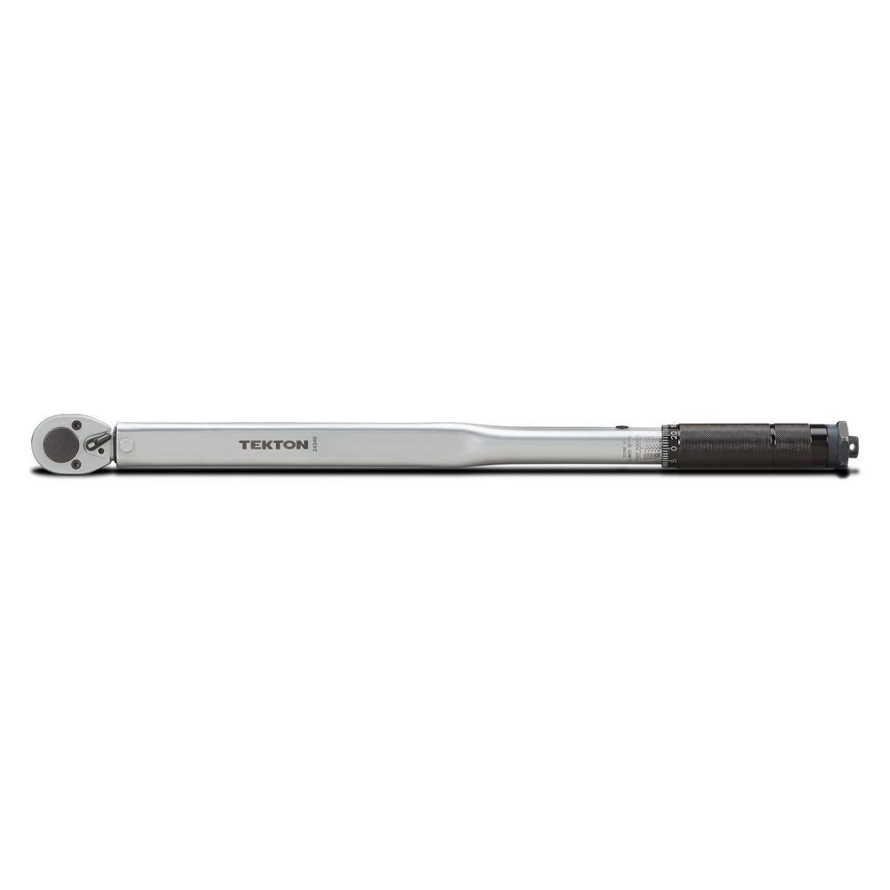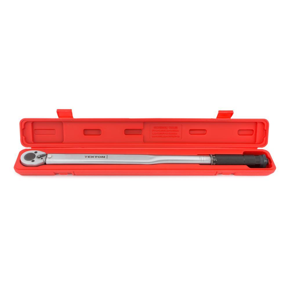 Calibrated to an accuracy of +/- 4%, the TEKTON 1/2 in. Drive Click Torque Wrench lets you work with confidence, eliminating guessing and the common tendency to overtighten fasteners. Correctly tightening fasteners to vehicle or equipment torque specifications ensures parts are properly secured without being damaged. Simple and easy to use, this wrench has a reversible ratcheting head that drives fasteners in both directions and measures torque in the clockwise direction. To measure torque, set the desired value on the handle scale (foot pounds or Newton meters) and begin tightening the fastener. When the preset torque value is reached, a reliable mechanical operation inside the handle produces a click you can hear and feel, alerting you to stop applying force. Built for consistent performance and years of dependable service, the mechanical design does not need batteries and the all-steel construction has no plastic parts to break or wear out. Important: This wrench is shipped pre-calibrated and ready to use. To help maintain calibration, store at its ARB265Wt setting of 25 ft./lb. (33.9 Nm) when not in use. Be sure to read and understand the operator's manual, including all safety information, before first use.
