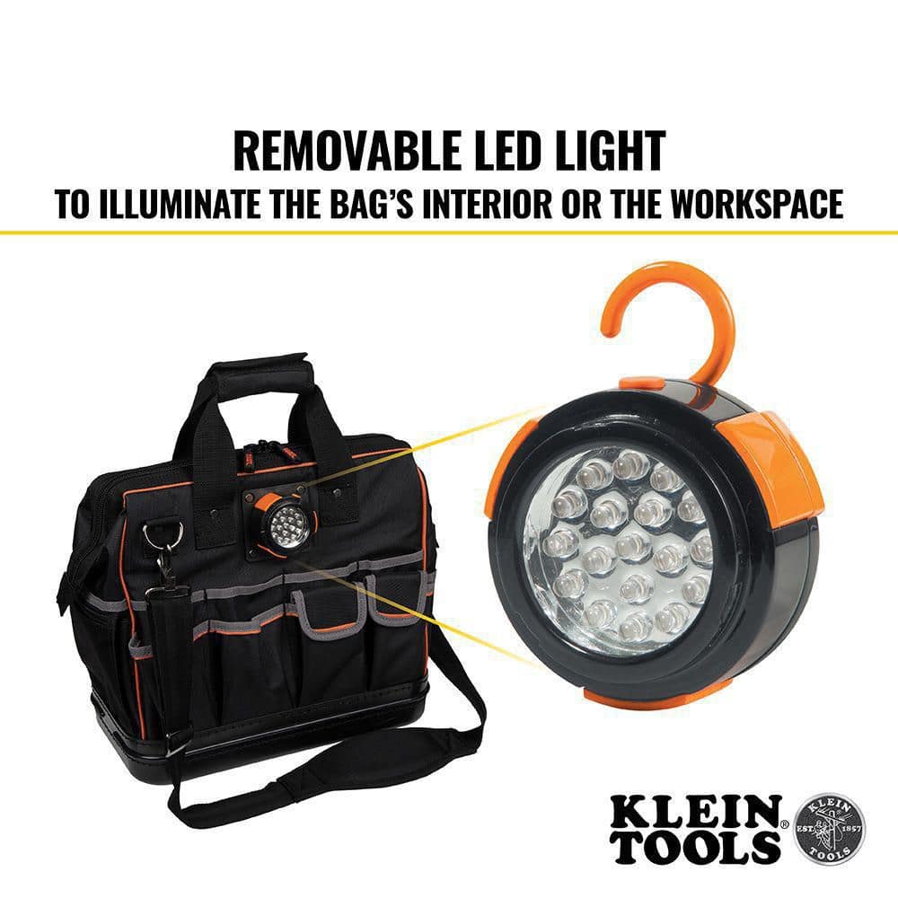 This bag brings a refined, rugged presence to the workspace—sleek black trimmed in vibrant orange for instant visibility. The standout removable LED light feels like a jewel of utility, casting clarity into every pocket. Style it with coordinated Klein tools and let the molded base ground the look with architectural solidity. A luxe essential for professionals who crave order, durability, and a touch of brilliance.