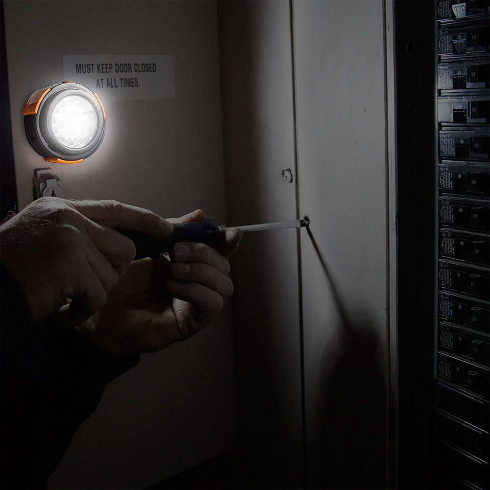 Removable LED Light: Twist-on/off lamp with hook and magnet for hands-free illumination inside the bag or at the jobsite