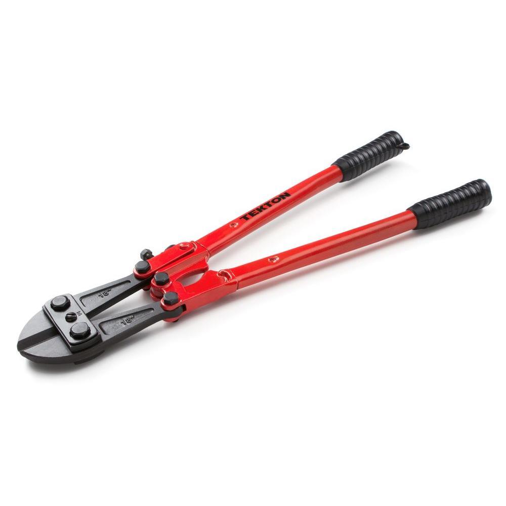 Cut bolts, chains, threaded rods, and more using the TEKTON 18 in. Bolt Cutter. Forged and hardened alloy steel jaws driven by a compound hinge deliver superior cutting power with less effort. Strong, high-leverage tubular steel handles will not twist or give under load, so you can confidently tackle even the toughest tasks. The soft rubber grips offer non-slip comfort, and the jaws are both adjustable and replaceable for long-lasting versatility.