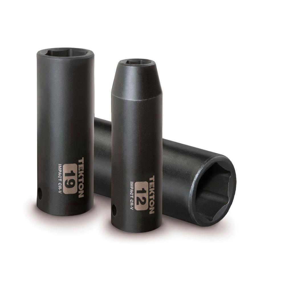 Regular price $50.00Built for use with impact tools, the TEKTON 1/2 in. Drive Deep Impact Sockets effortlessly break free rusty suspension and exhaust bolts, quickly remove stuck lug nuts, and loosen crank bolts with ease. TEKTON impact sockets efficiently transfer torque from impact wrench to fastener, loosening the most stubborn nuts and bolts. Made from high-strength chrome vanadium steel, our impact sockets are more resistant to drive end round out than standard impact sockets, resulting in a longer useable life. TEKTON impact sockets meet or exceed ANSI performance standards. The high-torque, 6-point socket grips the broad, flat sides of nuts and bolts, not just the corners, so there is no need to worry about stripping fastener head or damaging socket. An extra-deep broach enables you to access the entire length of fasteners. Even in low light, the high-contrast, permanent laser etched size markings are easy-to-read. The customized red TEKTON case can be stored in a tool chest or carried to your job site. Molded size markings keeps set organized and identifies any missing sockets.